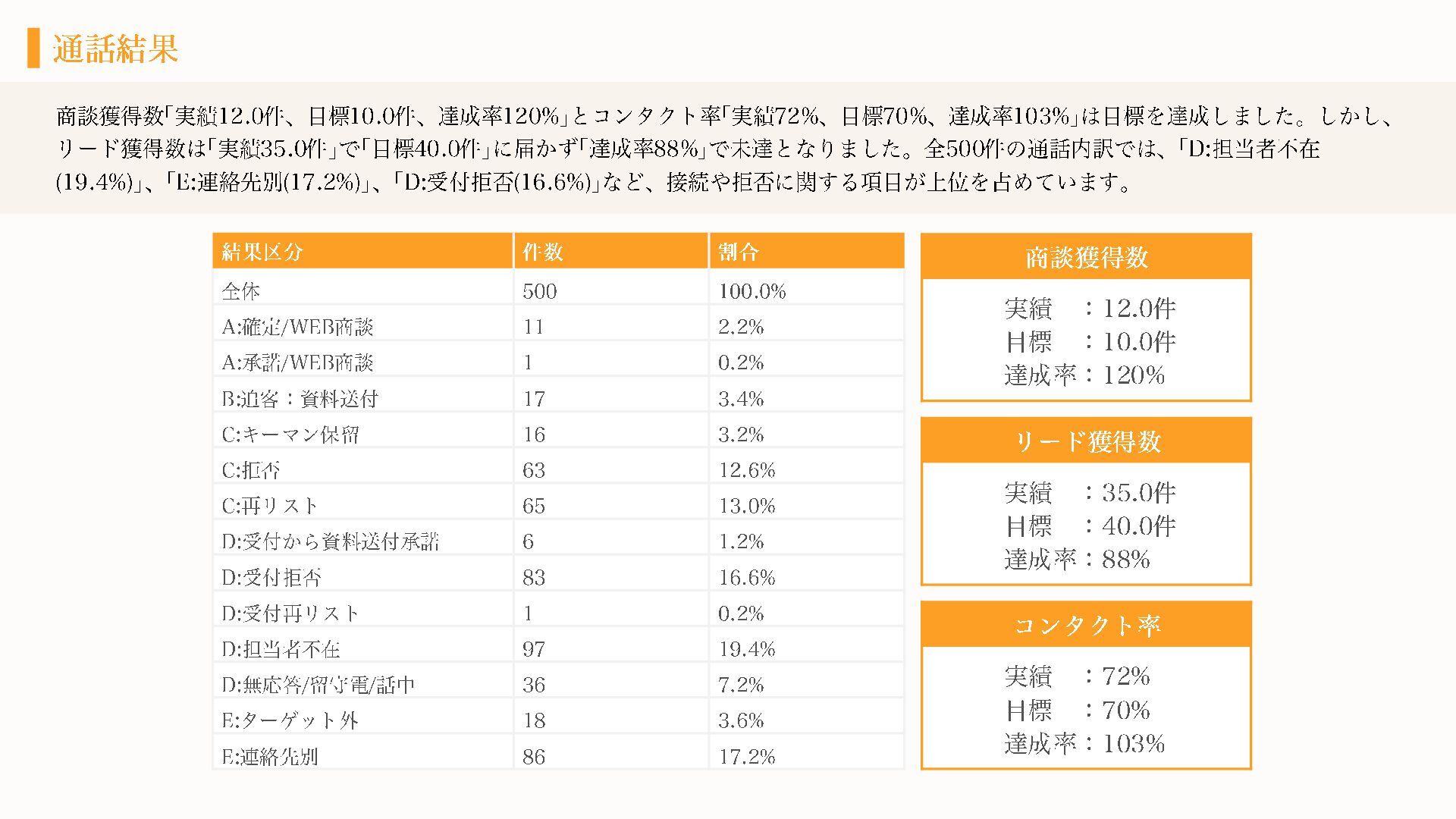 5/7 5/8 5/9 5/10 5/11 5/12 5/13 5/14 5/15 5/16 5/17 5/18 5/19 5/20 5/21 5/22 5/23 5/24 5/25 5/26 5/27 5/28 5/29 5/30 5/31 コール日 62 68 77 54 56 63 54 78 72 66 60 70 68 68 66 52 69 69 65 73 66 64 69 61 64 66 53 54 69 55 69 コンタクト日 20 26 26 18 12 23 17 19 17 19 19 23 22 18 18 13 27 23 21 19 18 22 24 16 13 21 9 20 20 19 18 アポイント 獲得日 1 0 2 1 1 1 0 2 3 2 2 3 0 1 1 0 1 4 1 0 2 3 3 1 0 1 1 1 0 1 1 コール アポ率 1.6% 0.0% 2.6% 1.9% 1.8% 1.6% 0.0% 2.6% 4.2% 3.0% 3.3% 4.3% 0.0% 1.5% 1.5% 0.0% 1.4% 5.8% 1.5% 0.0% 3.0% 4.7% 4.3% 1.6% 0.0% 1.5% 1.9% 1.9% 0.0% 1.8% 1.4% 1 0 2 1 1 1 0 2 3 2 2 3 0 1 1 0 1 4 1 0 2 3 3 1 0 1 1 1 0 1 1 0.0% 2.0% 4.0% 6.0% 8.0% 0 20 40 60 80 100 5/1 5/2 5/3 5/4 5/5 5/6 5/7 5/8 5/9 5/10 5/11 5/12 5/13 5/14 5/15 5/16 5/17 5/18 5/19 5/20 5/21 5/22 5/23 5/24 5/25 5/26 5/27 5/28 5/29 5/30 5/31 コール日 コンタクト日 アポイント獲得日 コールアポ率