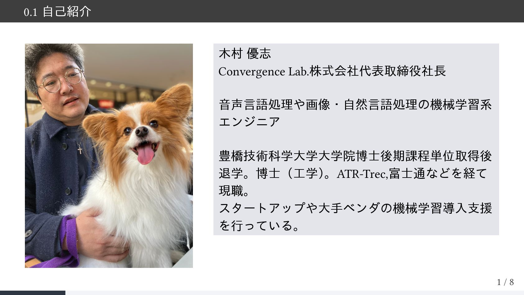 0.1 自己紹介 木村 優志 Convergence Lab.株式会社代表取締役社長 音声言語処理や画像・自然言語処理の機械学習系 エンジニア 豊橋技術科学大学大学院博士後期課程単位取得後 退学。博士(工学)