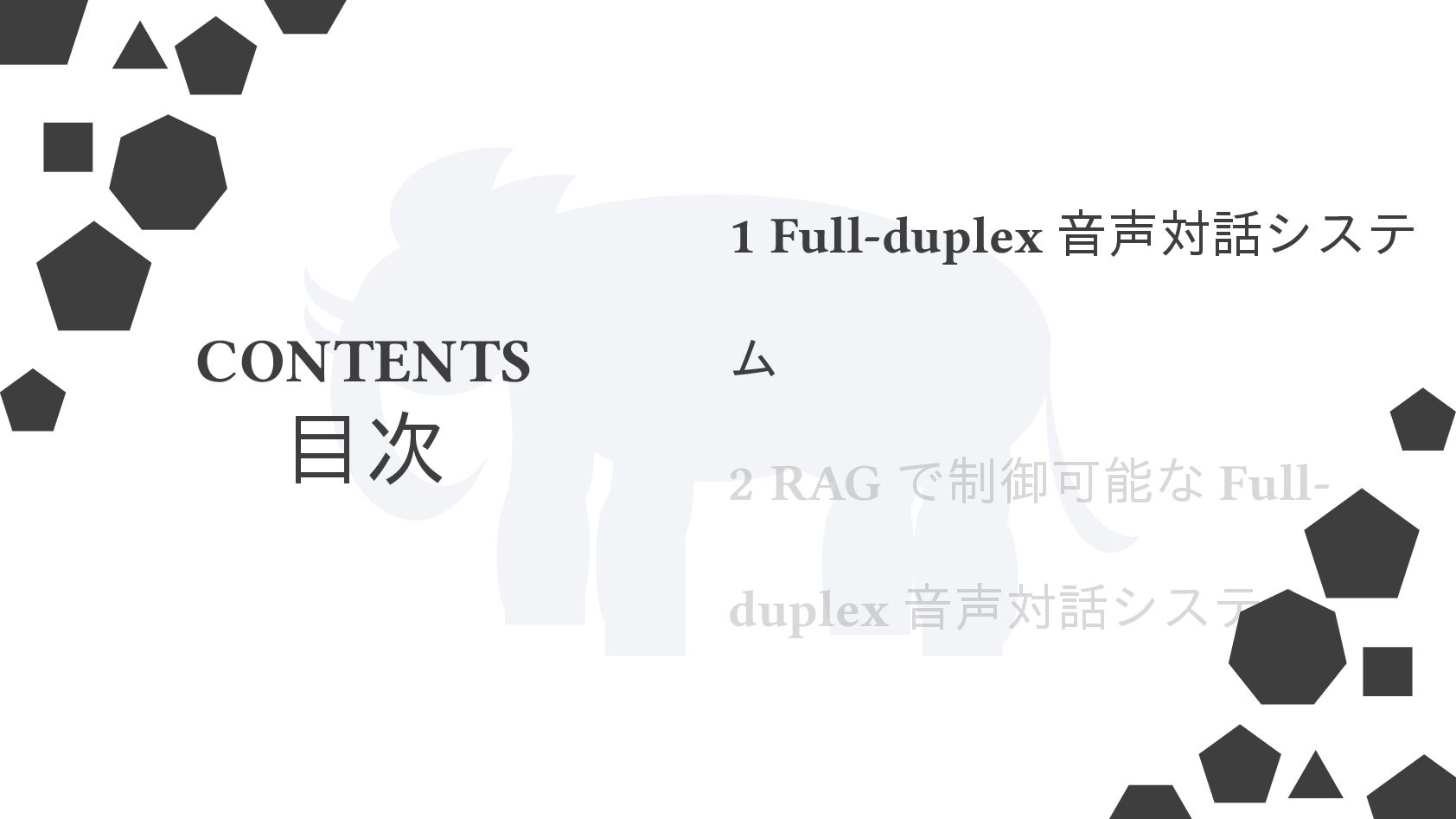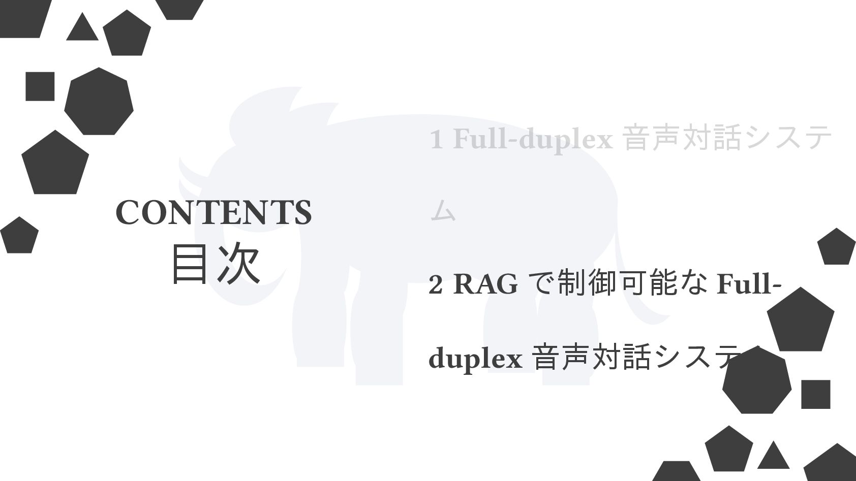 CONTENTS 目次 1 Full-duplex 音声対話システ ム 2 RAG で制御可能な Full-