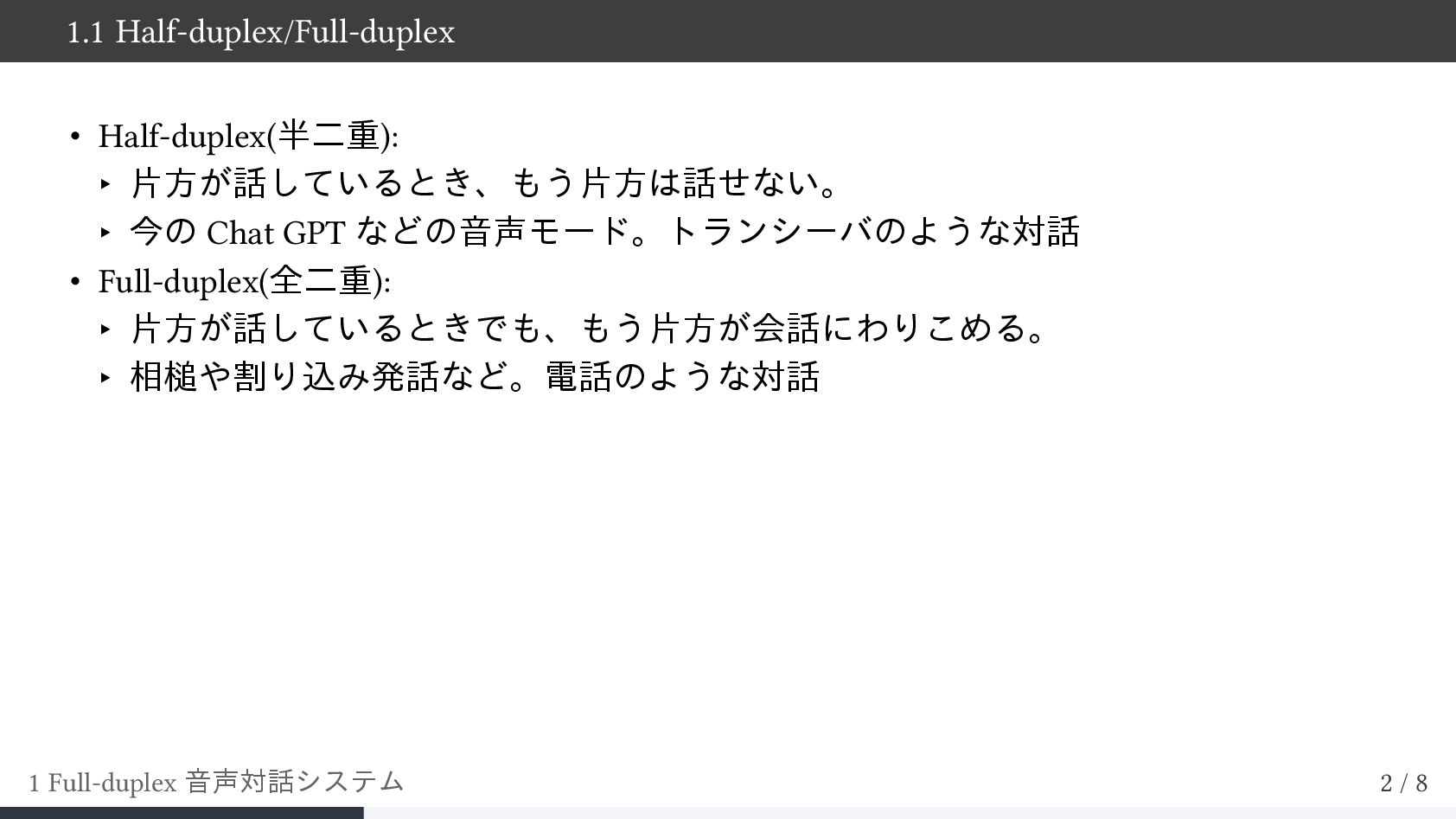 1.1 Half-duplex/Full-duplex • Half-duplex(半二重): ‣ 片方が話しているとき、もう片方は話せない。 ‣ 今の Chat GPT