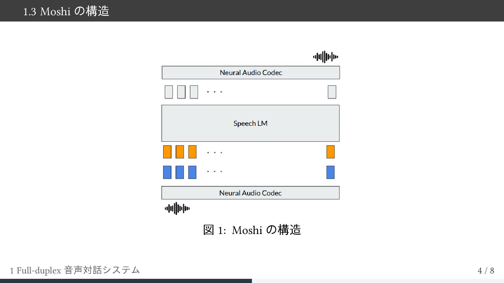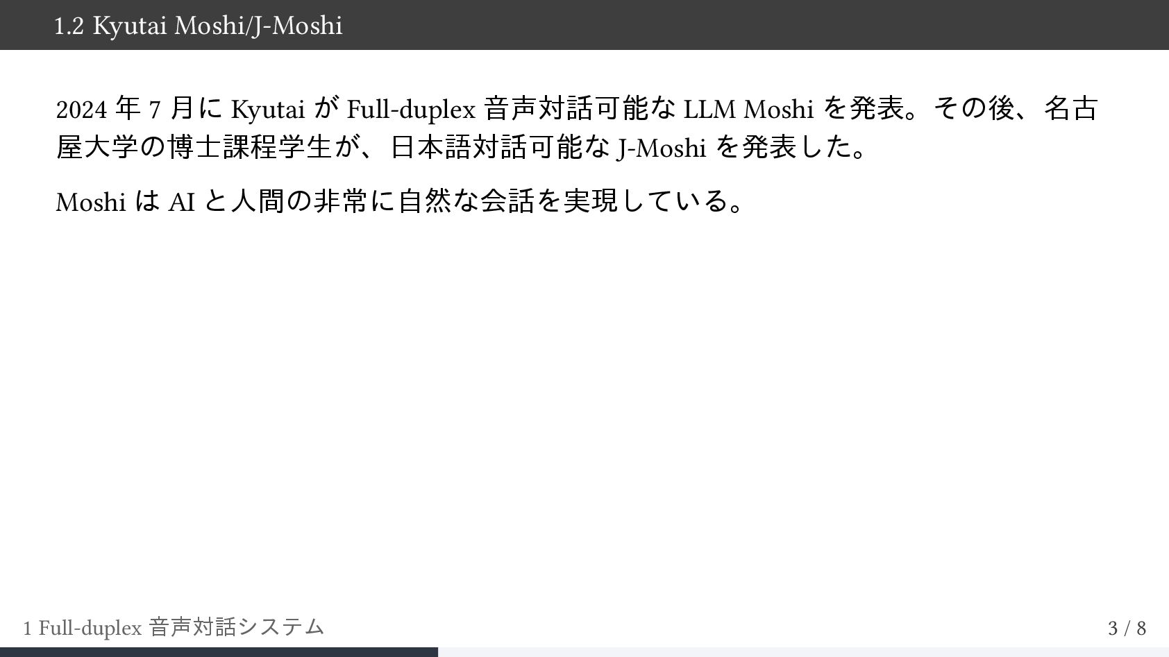 音声対話可能な LLM Moshi を発表。その後、名古 屋大学の博士課程学生が、日本語対話可能な J-Moshi を発表した。 Moshi は AI と人間の非常に自然な会話を実現している。 1 Full-duplex 音声対話システム 3 / 8