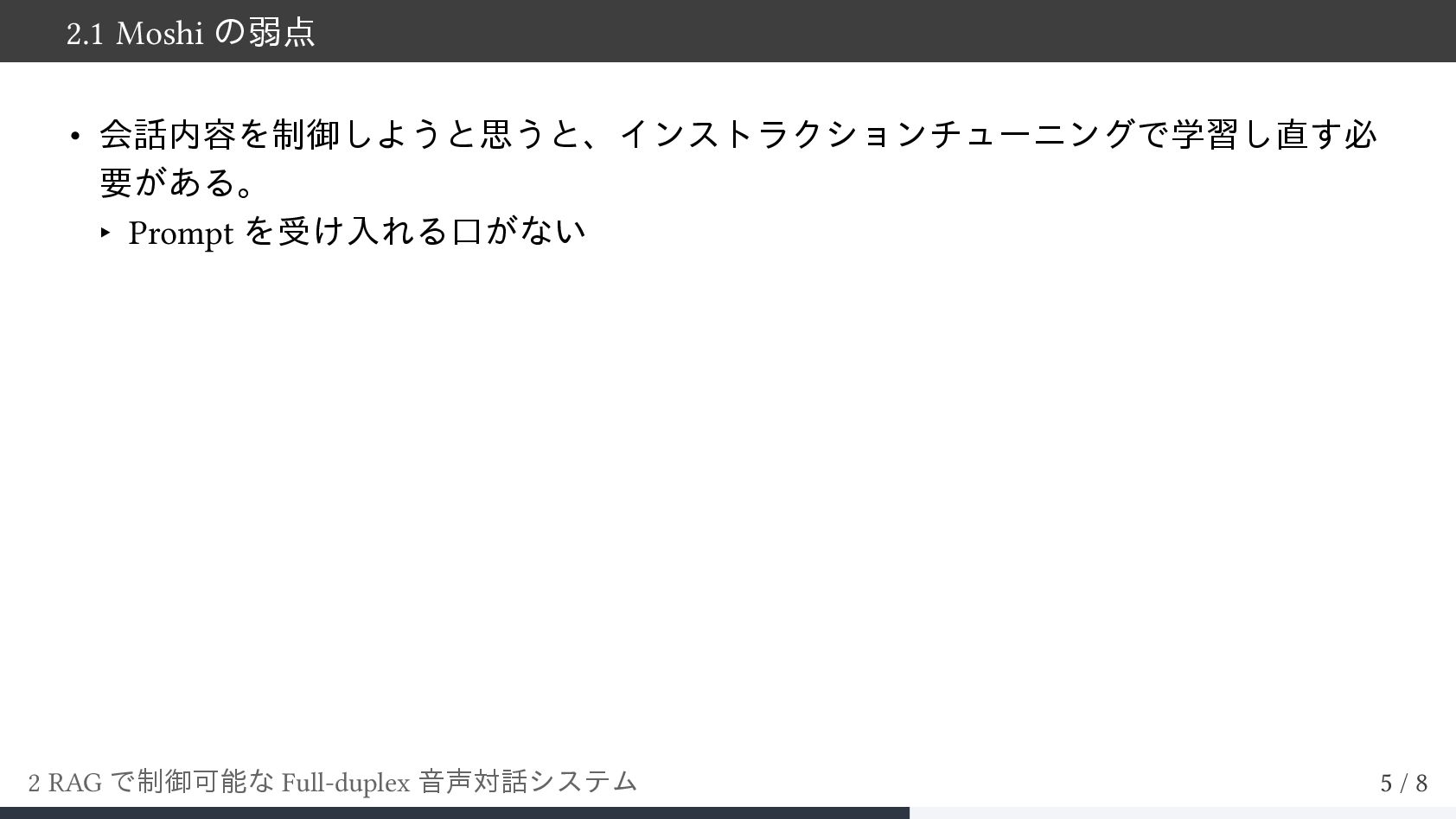2.1 Moshi の弱点 • 会話内容を制御しようと思うと、インストラクションチューニングで学習し直す必 要がある。 ‣ Prompt を受け入れる口がない 2