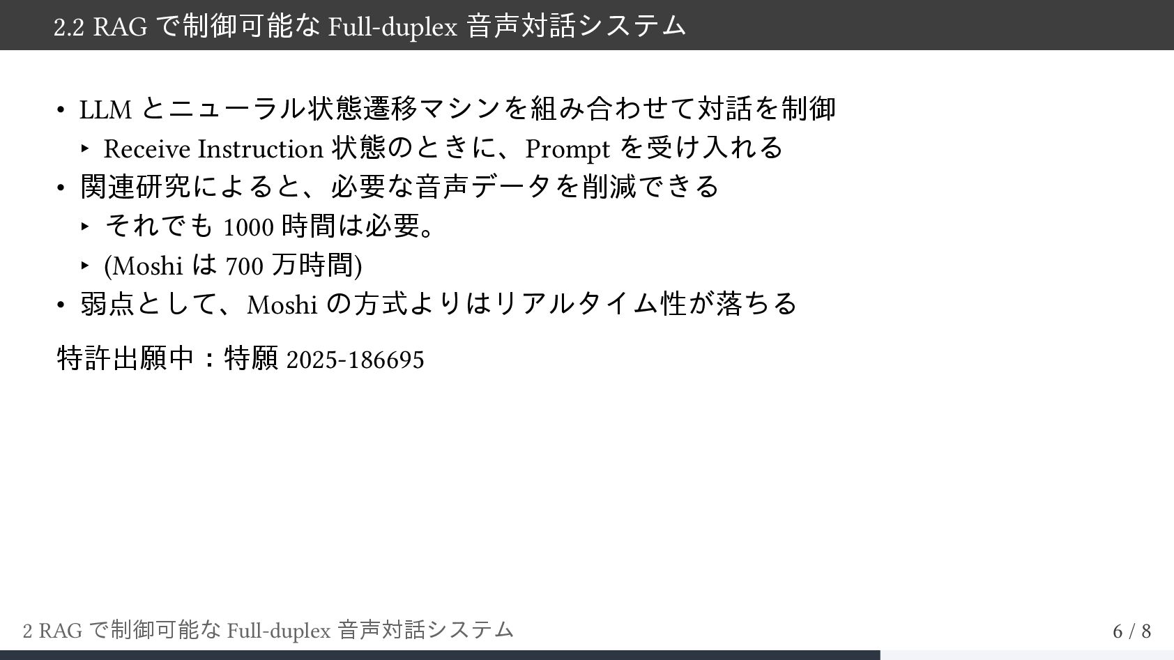 Instruction 状態のときに、Prompt を受け入れる • 関連研究によると、必要な音声データを削減できる ‣ それでも 1000 時間は必要。 ‣ (Moshi は 700 万時間) • 弱点として、Moshi の方式よりはリアルタイム性が落ちる 特許出願中:特願 2025-186695 2 RAG で制御可能な Full-duplex 音声対話システム 6 / 8
