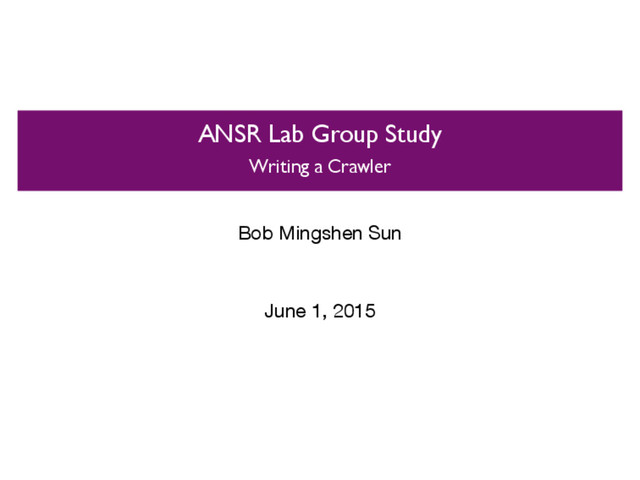 Internet bot which systematically browses the World Wide Web, typically for the purpose of Web indexing. A Web crawler may also be called a Web spider, an ant, an automatic indexer, or a Web scutter. Bob Mingshen Sun ANSR Lab Group Study June 1, 2015 3 / 56