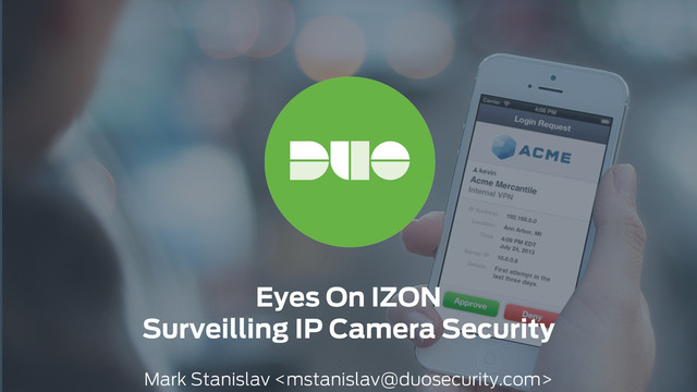 Home IP cameras are becoming increasingly common thanks to sleek designs, WiFi connectivity, and intuitive mobile applications. Previously, such IP cameras were mostly in-use by home security aficionados and small business owners. Now, however, with increasing video quality and ease of use, these cameras are becoming popular for the average homeowner that wants a bit more confidence that all is well when they're absent. This presentation will provide insight into the security mechanisms being used by the IZON camera, some of the weaknesses found during research, and a few recommendations for them (or anyone else developing these sorts of cameras) to benefit from. Attention will be paid to topics such as network protocols, iOS app security, APIs, and other aspects of the camera's platform that has attack surface.
