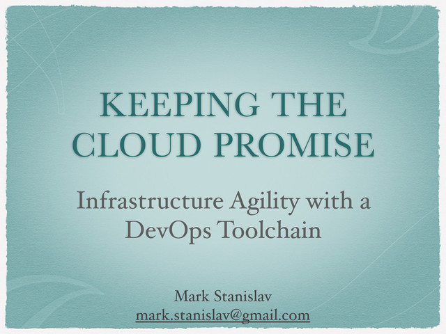 The agility of cloud computing can often be hampered by system administration techniques and infrastructure technologies that aren’t able to keep-up at an equal pace. The Development Operations (DevOps) movement helps to address many of the pace issues in cloud computing by bringing new life to team culture and implemented technologies. A mixture of pre-created and live demonstrations will be given for how a “DevOps Toolchain” can be implemented to build and maintain infrastructure, both cloud and virtualized.