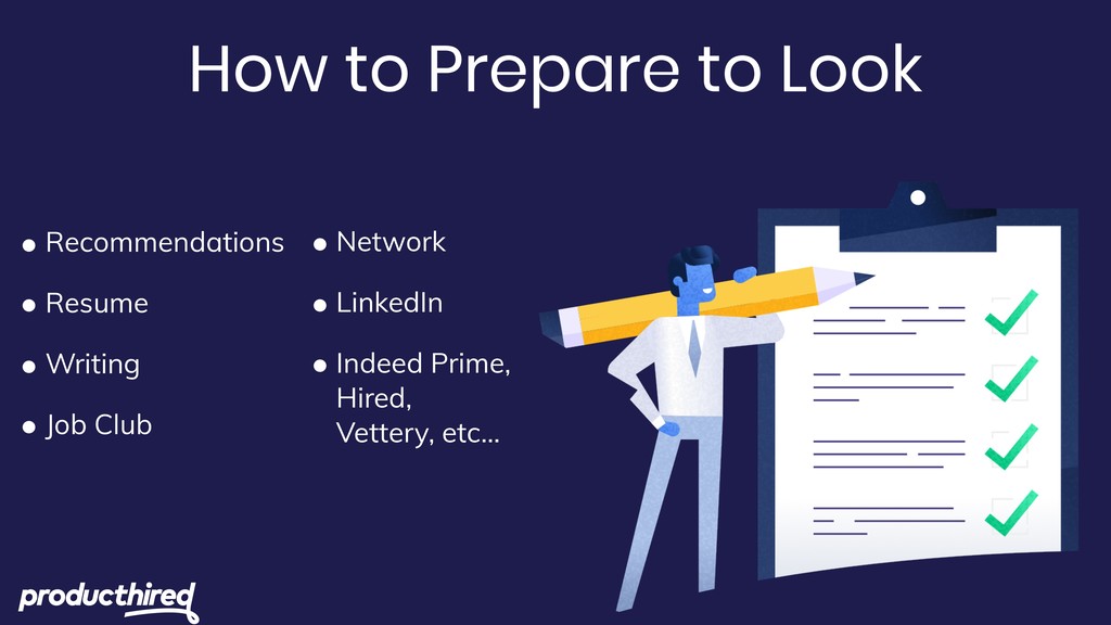unpublished! • Product Focused Boards: ProductHired.com, Mind The Product, Product School, Product Jobs • General Boards: indeed.com, Linkedin, Glassdoor, etc.. • Remote: virtualvocations.com, remoteok.io, weworkremotely.com • Get beach-head networks into power hubs, Google, Amazon, etc… • Get involved in the Community hackathons, volunteer, present, host, etc… • FOCUS! Don’t go broad and shallow, Go narrow and deep! Research the companies and know them well.