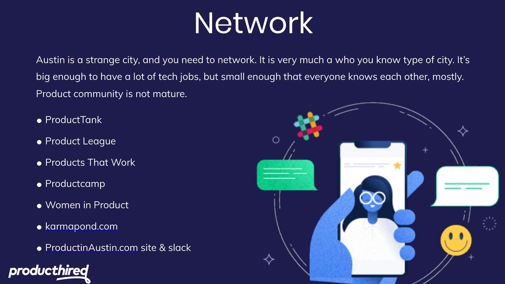network. It is very much a who you know type of city. It’s big enough to have a lot of tech jobs, but small enough that everyone knows each other, mostly. Product community is not mature. • ProductTank • Product League • Products That Work • Productcamp • Women in Product • karmapond.com • ProductinAustin.com site & slack