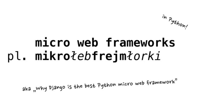 There are more Python "micro" web frameworks than you can count: Flask, Bottle, Pyramid, Tornado, web.py are some examples. Django is too strict and heavy from all extraneous lines of code to successfully compete with all of them. Is it? I will show you that Django is the best micro web framework!