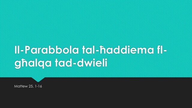 “Is-Saltna tas- Smewwiet tixbah lil wieħed sid li ħareġ filgħodu kmieni ħafna jsib nies għax- xogħol u jħaddimhom fil-għalqa tiegħu tad-dwieli. Ftiehem ma’ xi ħaddiema li jħallashom €100 għal ġurnata xogħol u bagħathom fl-għalqa. Reġa ħareġ fid- disgħa ta’ filgħodu, ra oħrajn qegħdin fil-pjazza, bla xogħol, u qalilhom, “Morru intom ukoll aħdmu fl-għalqa tiegħi, u nagħtikom li jkun ħaqqkom”. U marru. Reġa’ ħareġ għal xi nofsinhar, u mbagħad għal xi t-tlieta, u għamel l- istess. Għall-ħabta tal-ħamsa ta’ wara nofsinhar reġa’ ħareġ u sab oħrajn bla xogħol, u qalilhom, “Għaliex qegħdin hawn il-jum kollu ma tagħmlu xejn?” Qalulu, “Ghax ħadd ma qabbadna.” Qalilhom, “Morru intom ukoll aħdmu fl- għalqa tiegħi.”