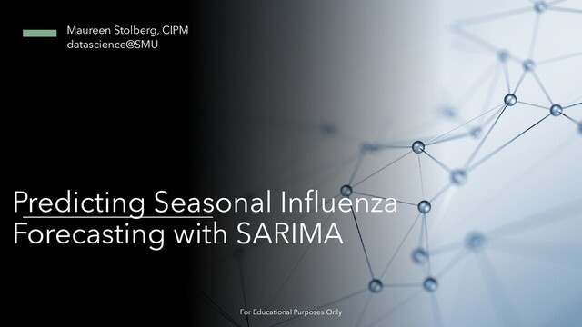 comparison is shown below. The graph clearly shows that ARIMA 2,1,0 yielded better results when compared to the actual data series. Model ASE Score SARIMA (3,1,0) x (0,1,1) 52 0.3202319 SARIMA (2,1,0) x (0,1,1) 52 0.2160492 SARIMA (3,1,1) x (0,1,1) 52 0.2341707 Based on the results of the goodness-of-fit test statistics, SARIMA (2,1,0)x(0,1,1)52 was found to be the optimal model, which had the second lowest ranking (BIC = -2.958586). The SARIMA(p, d, q) model selected was SARIMA(2,1,0) x (0,1,1)52 Model RMSE Score SARIMA (3,1,0) x (0,1,1) 52 0.5658903 SARIMA (2,1,0) x (0,1,1) 52 0.4648109 SARIMA (3,1,1) x (0,1,1) 52 0.4839119 For Educational Purposes Only