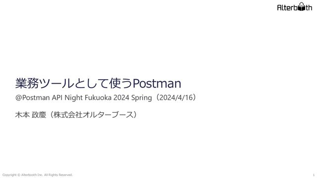 業務ツールとして使うPostman @Postman API Night Fukuoka 2024 Spring(2024/4/16) 木本 政慶(株式会社オルターブース) Copyright