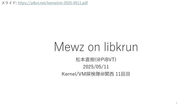 Mewz on libkrun 松本直樹(@PiBVT) 2025/05/11 Kernel/VM探検隊@関西 11回目 スライド: https://pibvt.net/kernelvm-2025-0511.pdf 1