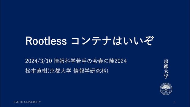 Rootless コンテナはいいぞ 2024/3/10 情報科学若手の会春の陣2024 松本直樹(京都大学 情報学研究科) 1