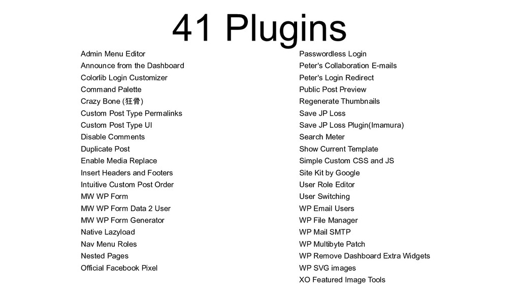 Command Palette Crazy Bone (狂骨) Custom Post Type Permalinks Custom Post Type UI Disable Comments Duplicate Post Enable Media Replace Insert Headers and Footers Intuitive Custom Post Order MW WP Form MW WP Form Data 2 User MW WP Form Generator Native Lazyload Nav Menu Roles Nested Pages Official Facebook Pixel Passwordless Login Peter's Collaboration E-mails Peter's Login Redirect Public Post Preview Regenerate Thumbnails Save JP Loss Save JP Loss Plugin(Imamura) Search Meter Show Current Template Simple Custom CSS and JS Site Kit by Google User Role Editor User Switching WP Email Users WP File Manager WP Mail SMTP WP Multibyte Patch WP Remove Dashboard Extra Widgets WP SVG images XO Featured Image Tools 41 Plugins