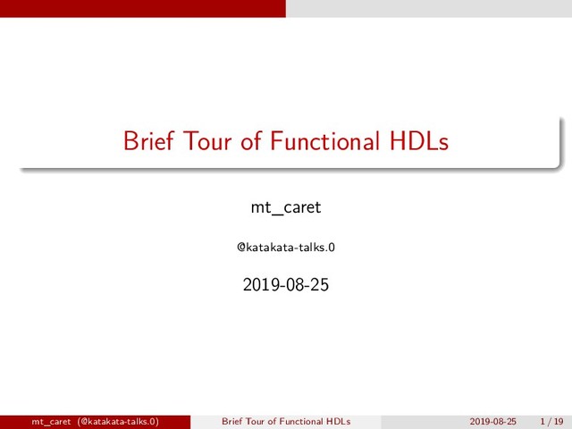 chisel3, version: 3.1.3, scalaVersion: 2.11.12, ; sbtVersion: 1.1.1, builtAtString: 2018-09-12 19:37:29.007, ; builtAtMillis: 1536781049007 circuit Counter : module Counter : input clock : Clock input reset : UInt<1> output io : {q : UInt<8>} reg cntReg : UInt<8>, clock with : (reset => (reset, UInt<8>("h00"))) @[Counter.scala 9:23] node _T_10 = add(cntReg, UInt<1>("h01")) @[Counter.scala 11:20] node _T_11 = tail(_T_10, 1) @[Counter.scala 11:20] cntReg <= _T_11 @[Counter.scala 11:10] io.q <= cntReg @[Counter.scala 12:8] mt_caret (@katakata-talks.0) Brief Tour of Functional HDLs 2019-08-25 13 / 19