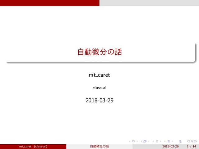 AD Demo import Numeric.AD grad’ (\[x,y,z] -> sin (x*y) + z) [0, 1, 0] f(x, y, z) = sin(x ∗ y) + z ∂f ∂x = y ∗ cos(x ∗ y) ∂f ∂y = x ∗ cos(x ∗ y) ∂f ∂z = 1 mt caret (class-ai) ࣗಈඍͷ 2018-03-29 13 / 14
