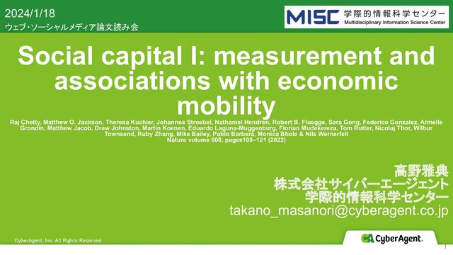 Chetty, Matthew O. Jackson, Theresa Kuchler, Johannes Stroebel, Nathaniel Hendren, Robert B. Fluegge, Sara Gong, Federico Gonzalez, Armelle Grondin, Matthew Jacob, Drew Johnston, Martin Koenen, Eduardo Laguna-Muggenburg, Florian Mudekereza, Tom Rutter, Nicolaj Thor, Wilbur Townsend, Ruby Zhang, Mike Bailey, Pablo Barberá, Monica Bhole & Nils Wernerfelt Nature volume 608, pages108–121 (2022) 2024/1/18 ウェブ・ソーシャルメディア論文読み会 CyberAgent, Inc. All Rights Reserved 高野雅典 株式会社サイバーエージェント 学際的情報科学センター [email protected] 1