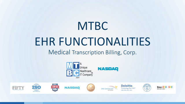 use Web Based Electronic Health Records Software and have many functionalities as listed: • E -Prescribing • Health Records • Patient Charts • Patient Scheduler • Lab Integration • Secure Messaging • Web EHR Dashboard • Mobile Applications • Care Connector • Specialty Modules MTBC Web EHR FUNCTIONALITIES 2