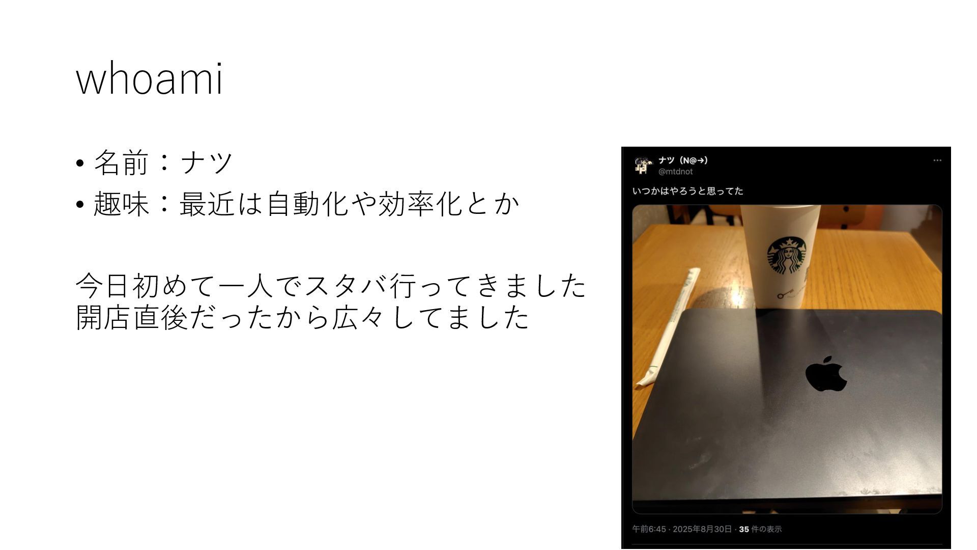 whoami • 名前:ナツ • 趣味:最近は自動化や効率化とか 今日初めて一人でスタバ行ってきました 開店直後だったから広々してました