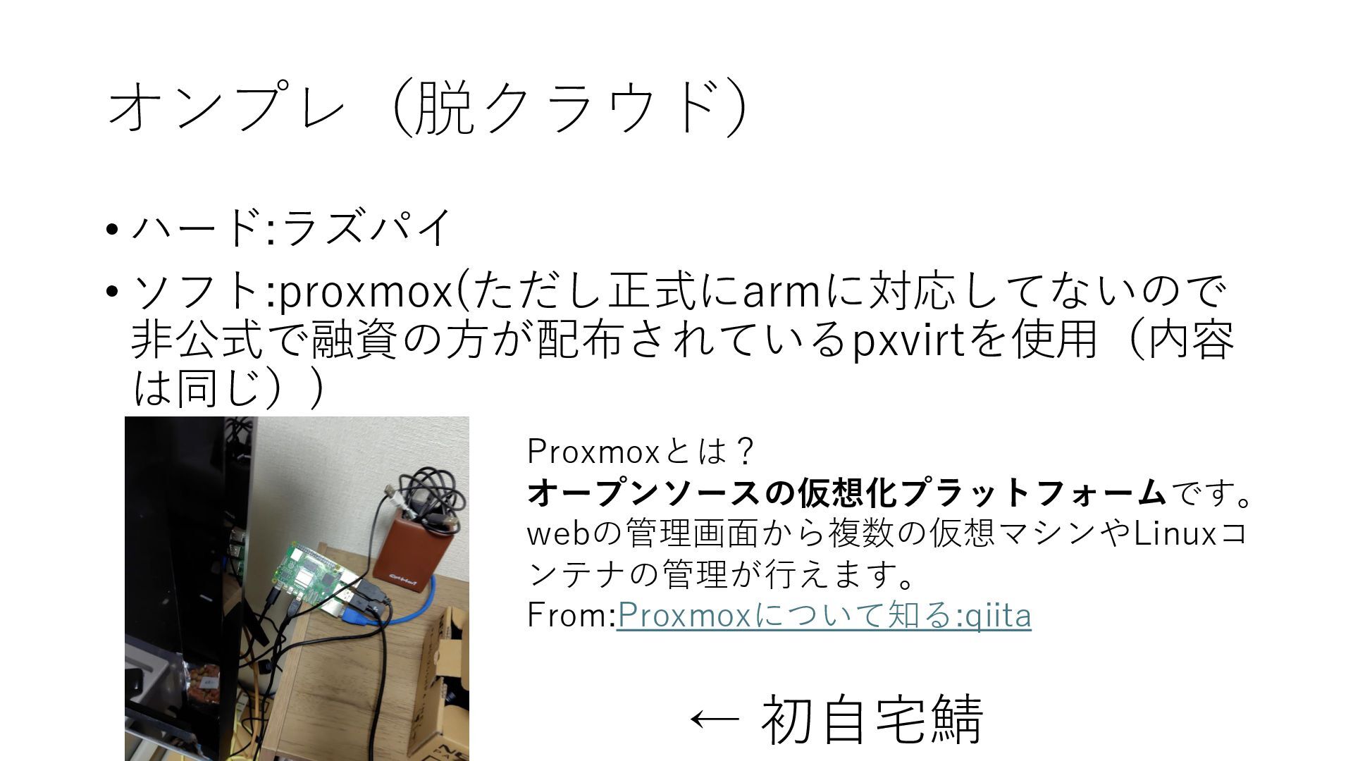 オンプレ(脱クラウド) • ハード:ラズパイ • ソフト:proxmox(ただし正式にarmに対応してないので 非公式で融資の方が配布されているpxvirtを使用(内容 は同じ)) ← 初自宅鯖 Proxmoxとは?
