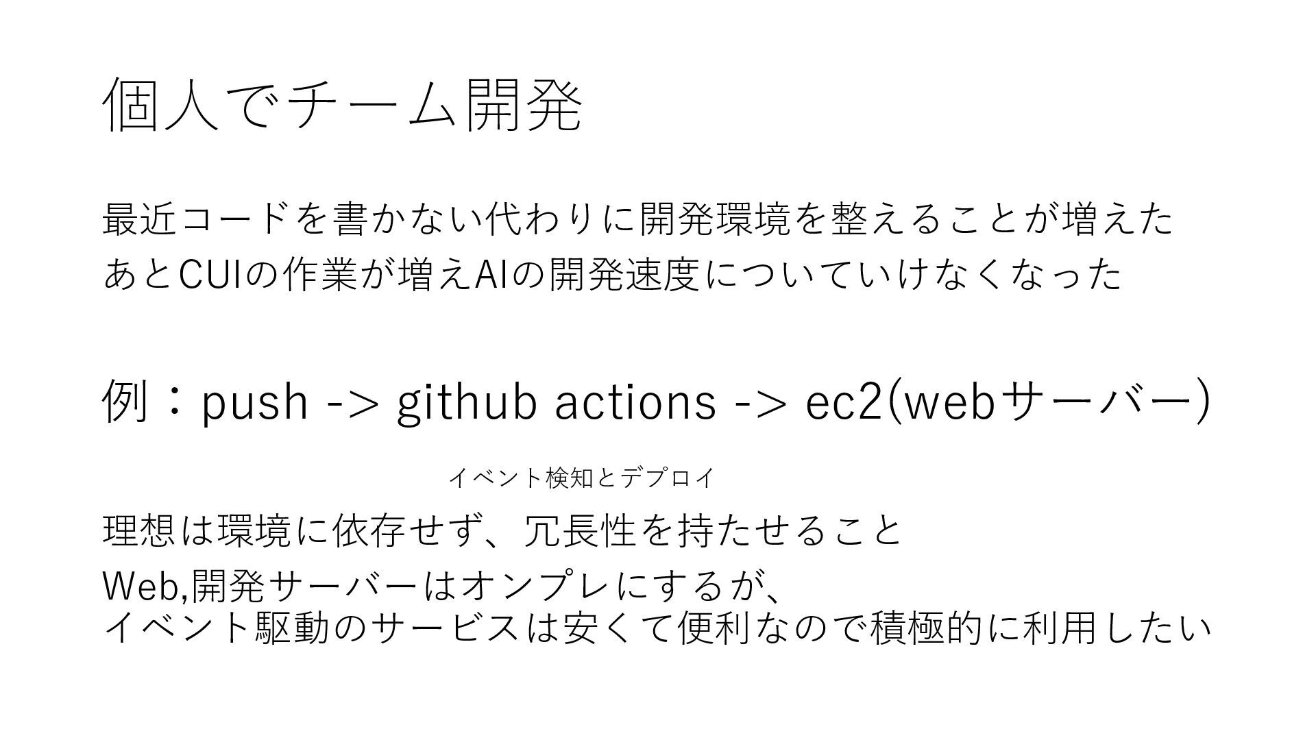 個人でチーム開発 最近コードを書かない代わりに開発環境を整えることが増えた あとCUIの作業が増えAIの開発速度についていけなくなった 例:push -> github actions -> ec2(webサーバー) イベント検知とデプロイ