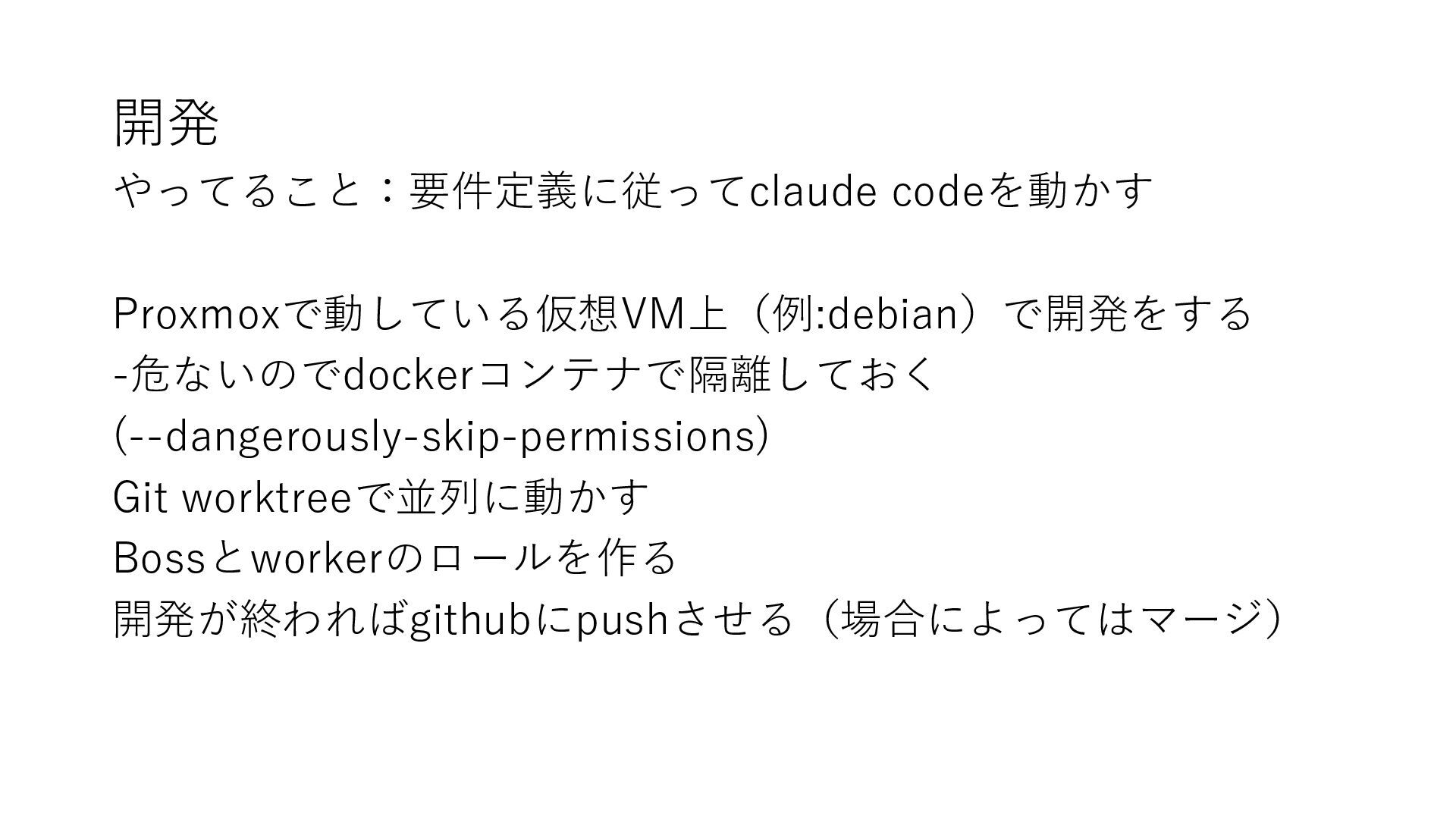 開発 やってること:要件定義に従ってclaude codeを動かす Proxmoxで動している仮想VM上(例:debian)で開発をする -危ないのでdockerコンテナで隔離しておく (--dangerously-skip-permissions) Git worktreeで並列に動かす Bossとworkerのロールを作る 開発が終わればgithubにpushさせる(場合によってはマージ)