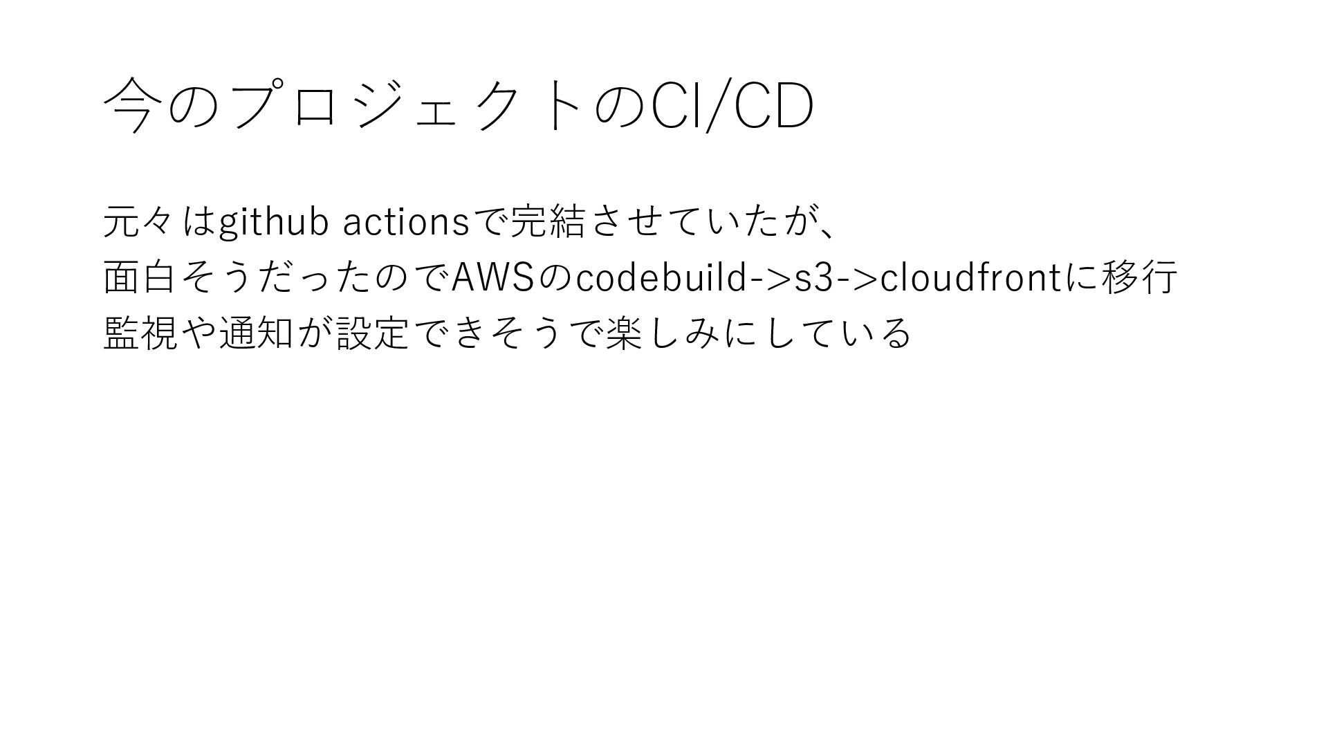 今のプロジェクトのCI/CD 元々はgithub actionsで完結させていたが、 面白そうだったのでAWSのcodebuild->s3->cloudfrontに移行 監視や通知が設定できそうで楽しみにしている