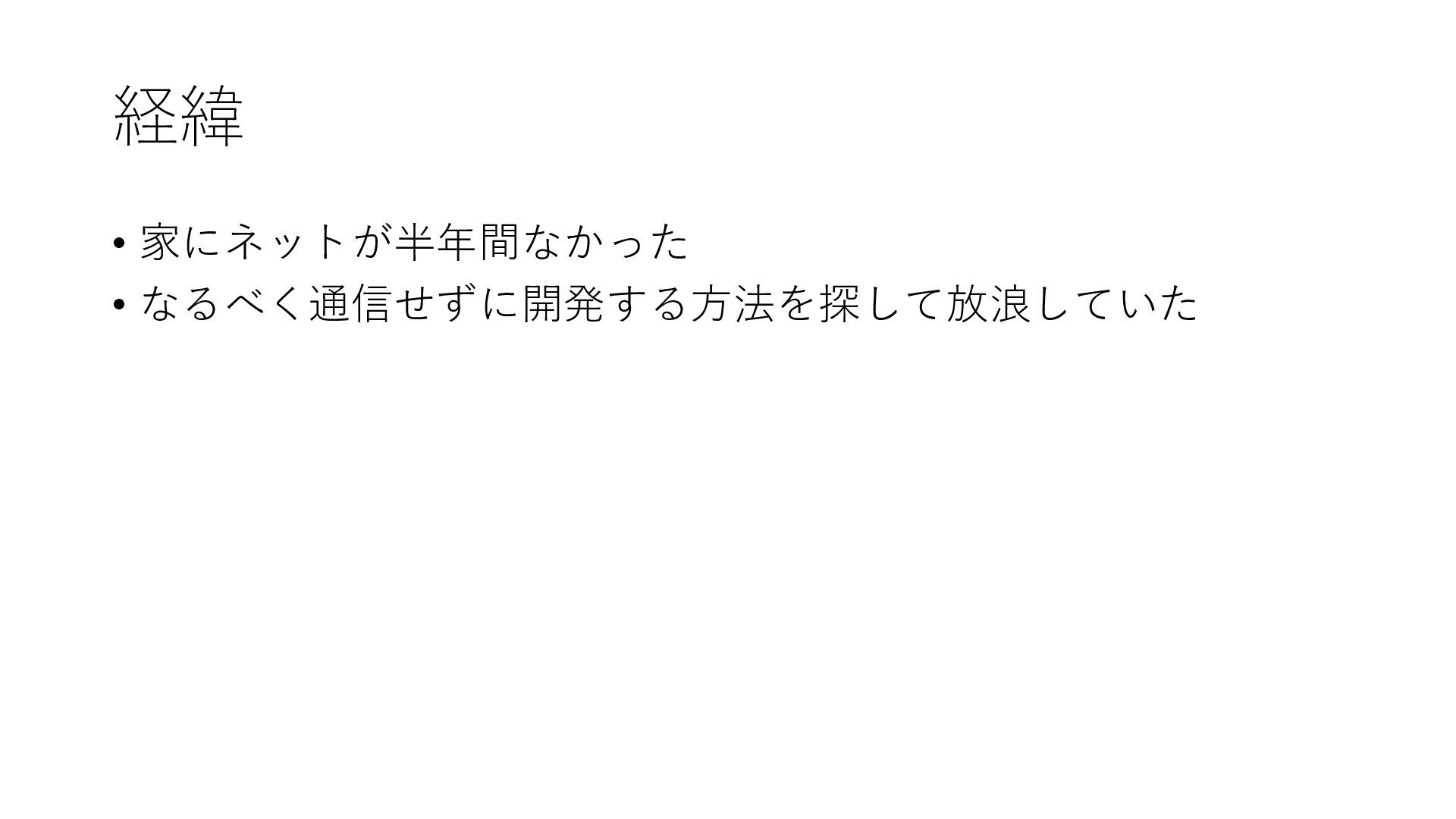 経緯 • 家にネットが半年間なかった • なるべく通信せずに開発する方法を探して放浪していた