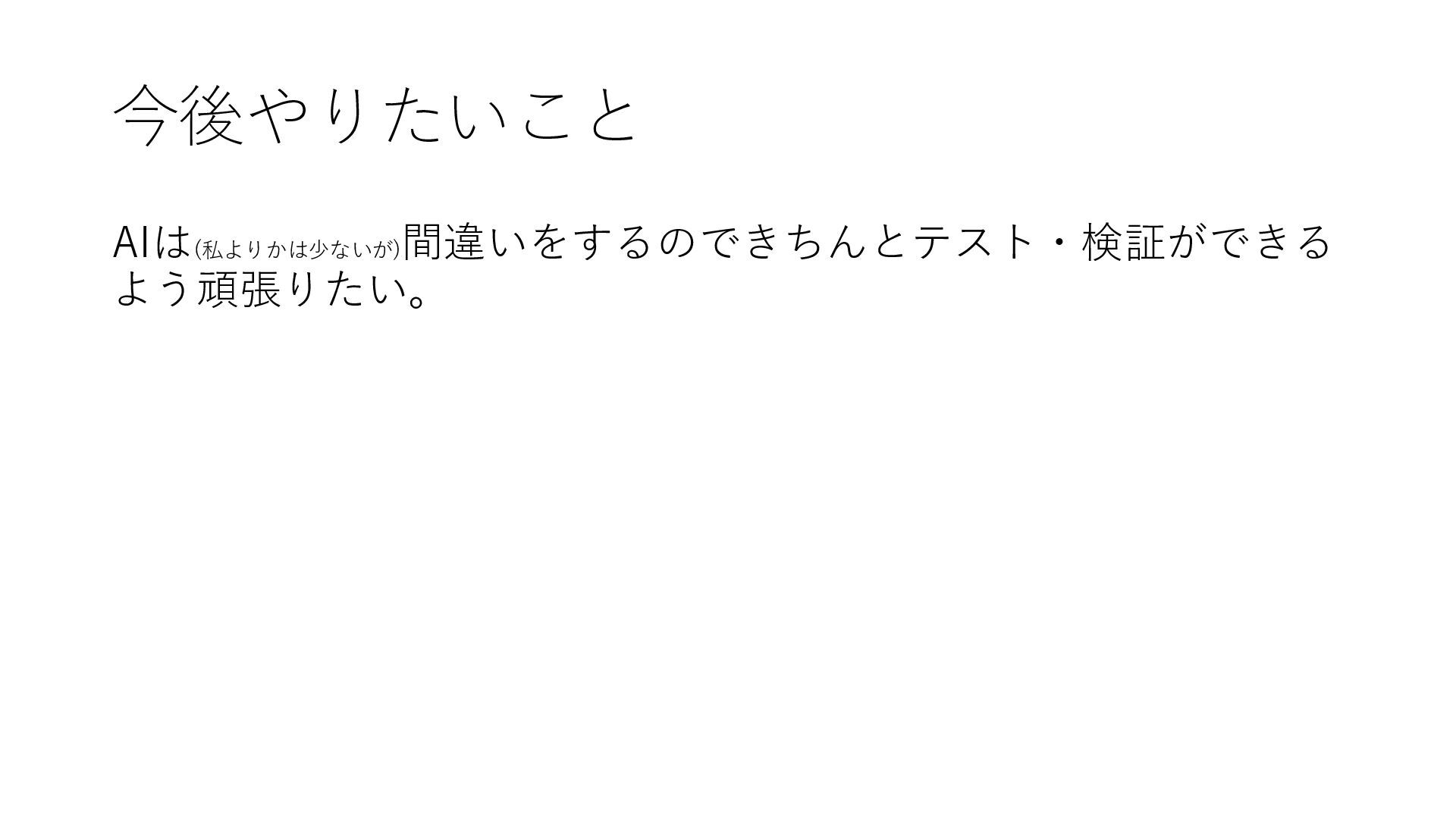 今後やりたいこと AIは(私よりかは少ないが) 間違いをするのできちんとテスト・検証ができる よう頑張りたい。