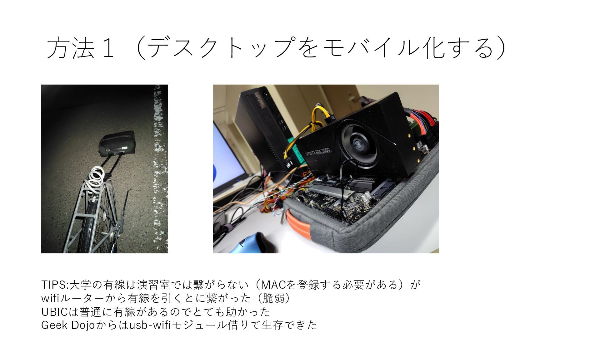 方法1(デスクトップをモバイル化する) TIPS:大学の有線は演習室では繋がらない(MACを登録する必要がある)が wifiルーターから有線を引くとに繋がった(脆弱) UBICは普通に有線があるのでとても助かった Geek Dojoからはusb-wifiモジュール借りて生存できた
