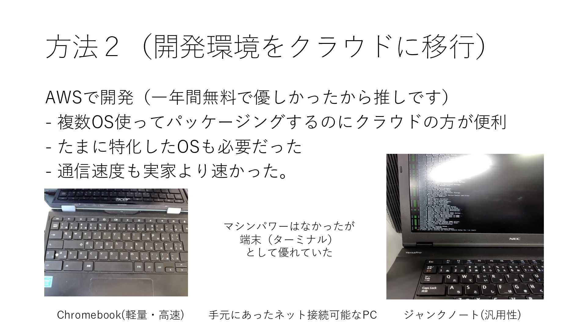 方法2(開発環境をクラウドに移行) AWSで開発(一年間無料で優しかったから推しです) - 複数OS使ってパッケージングするのにクラウドの方が便利 - たまに特化したOSも必要だった - 通信速度も実家より速かった。 Chromebook(軽量・高速) ジャンクノート(汎用性)