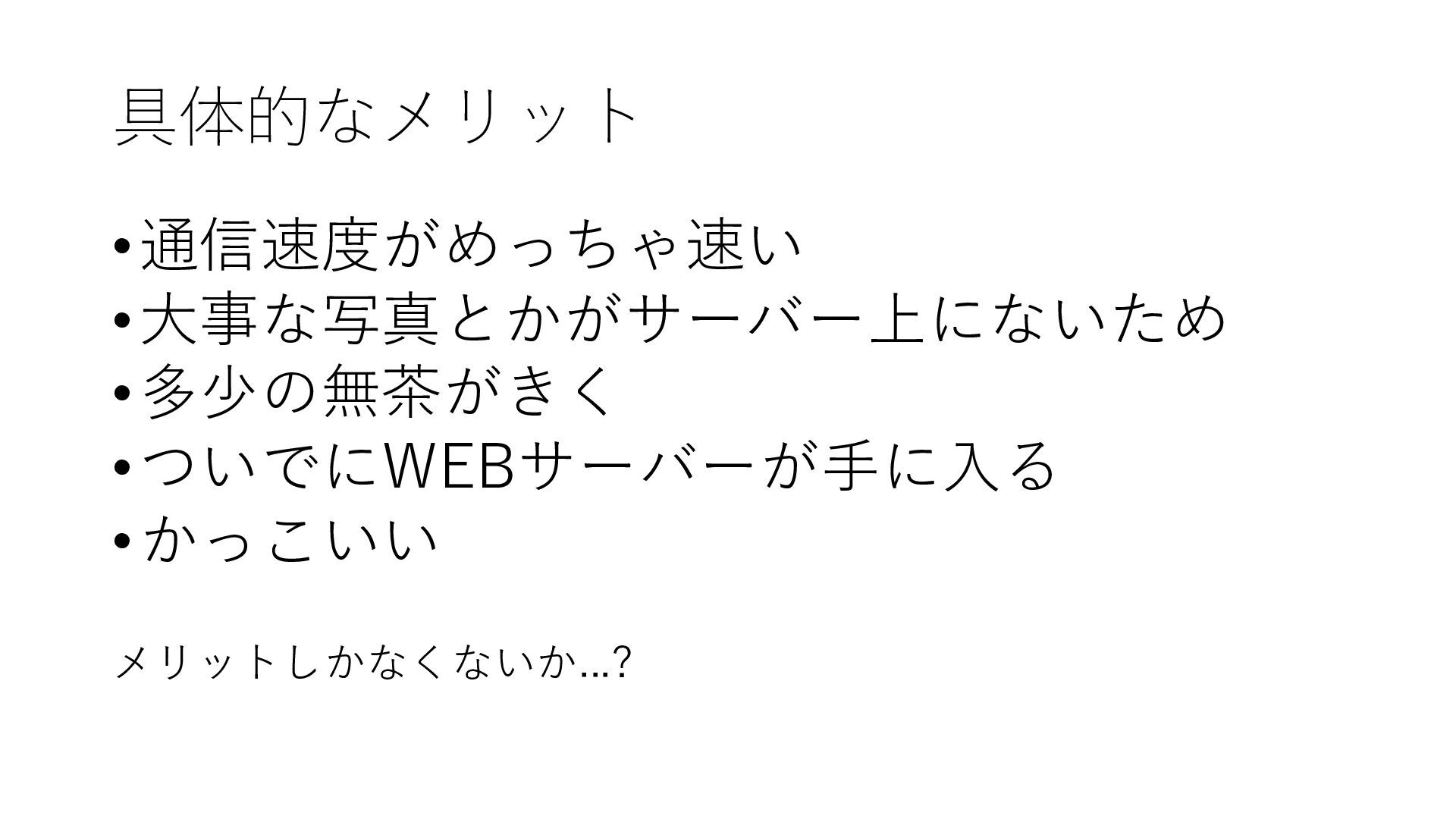 具体的なメリット •通信速度がめっちゃ速い •大事な写真とかがサーバー上にないため •多少の無茶がきく •ついでにWEBサーバーが手に入る •かっこいい メリットしかなくないか...?