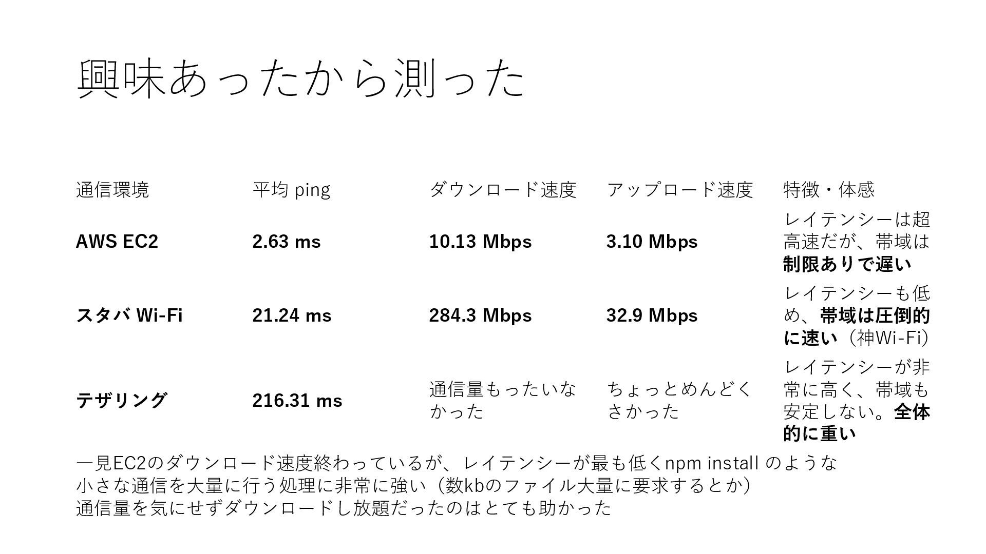 ms 10.13 Mbps 3.10 Mbps レイテンシーは超 高速だが、帯域は 制限ありで遅い スタバ Wi-Fi 21.24 ms 284.3 Mbps 32.9 Mbps レイテンシーも低 め、帯域は圧倒的 に速い(神Wi-Fi) テザリング 216.31 ms 通信量もったいな かった ちょっとめんどく さかった レイテンシーが非 常に高く、帯域も 安定しない。全体 的に重い 一見EC2のダウンロード速度終わっているが、レイテンシーが最も低くnpm install のような 小さな通信を大量に行う処理に非常に強い(数kbのファイル大量に要求するとか) 通信量を気にせずダウンロードし放題だったのはとても助かった