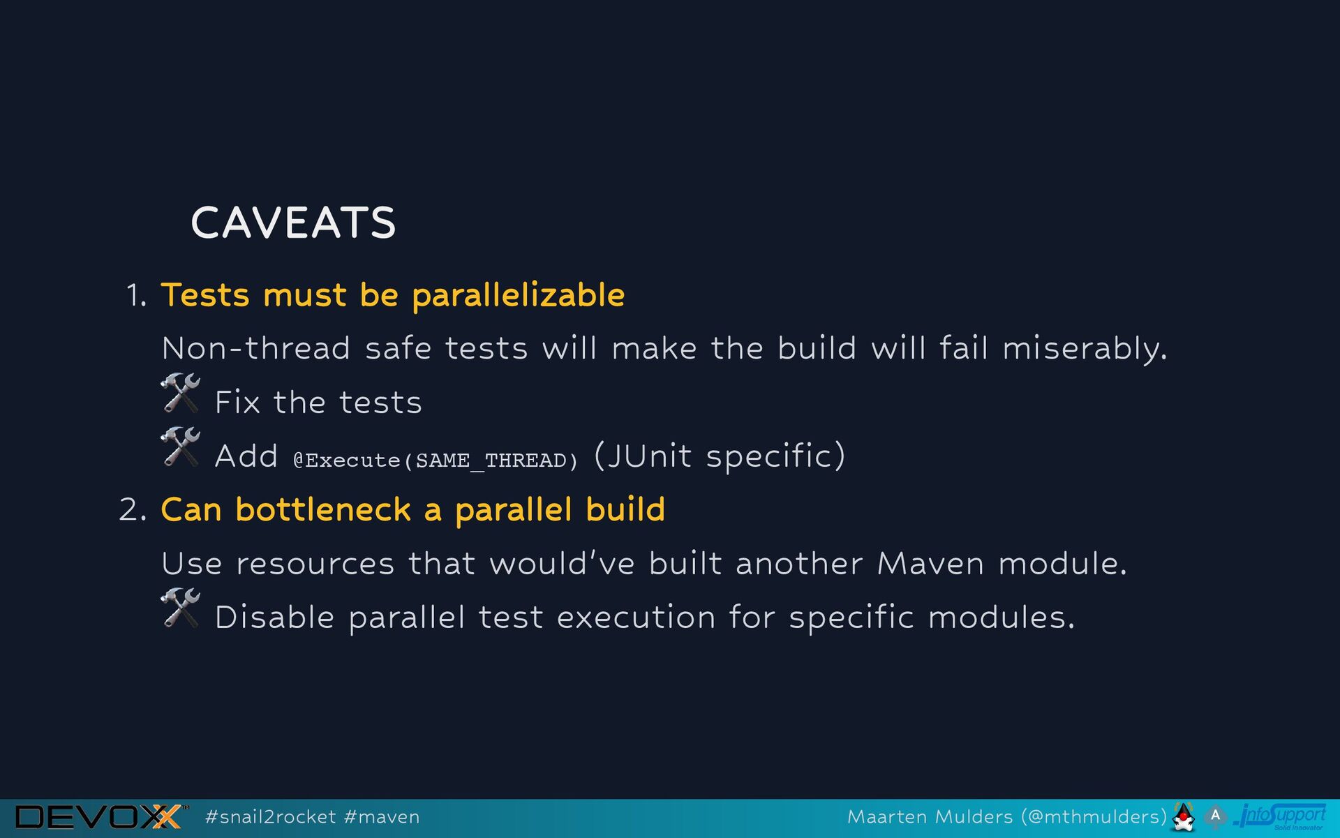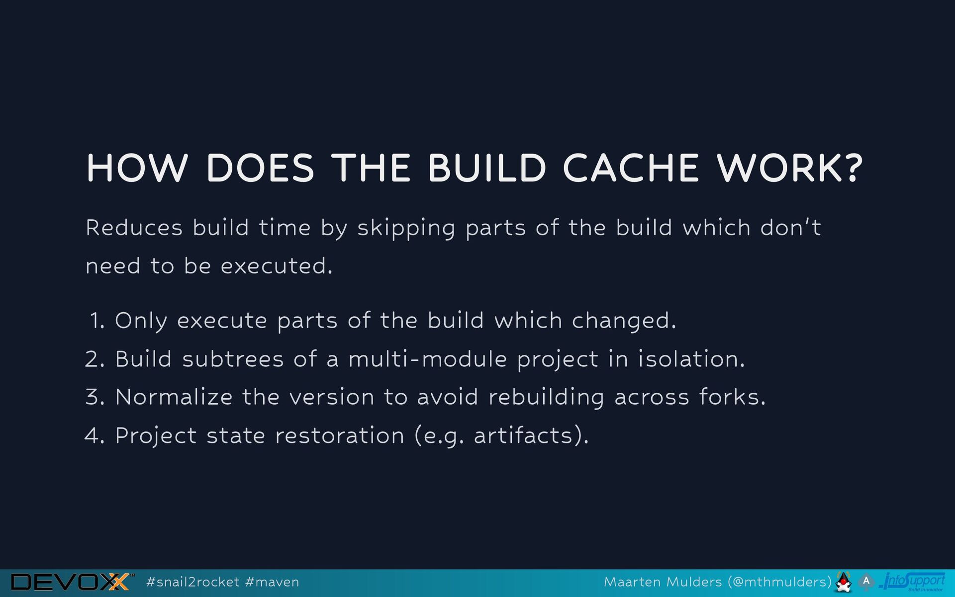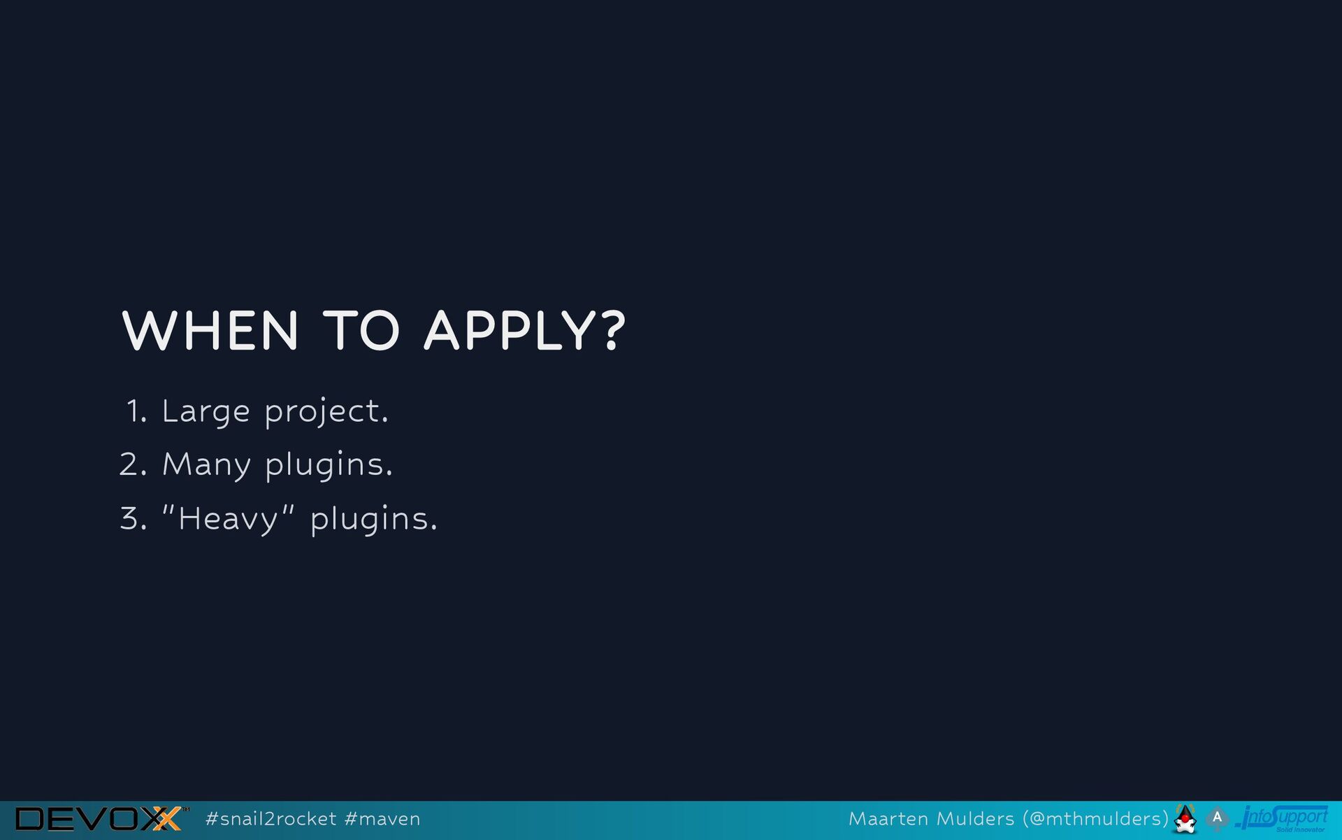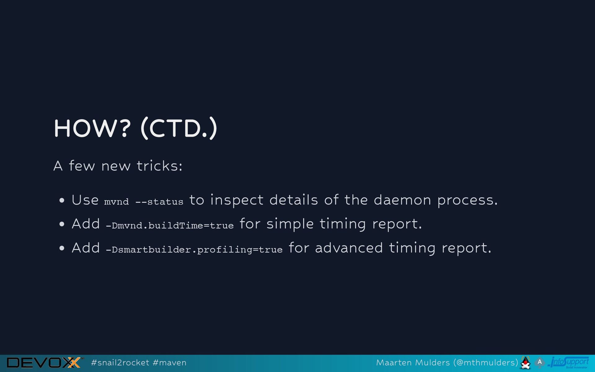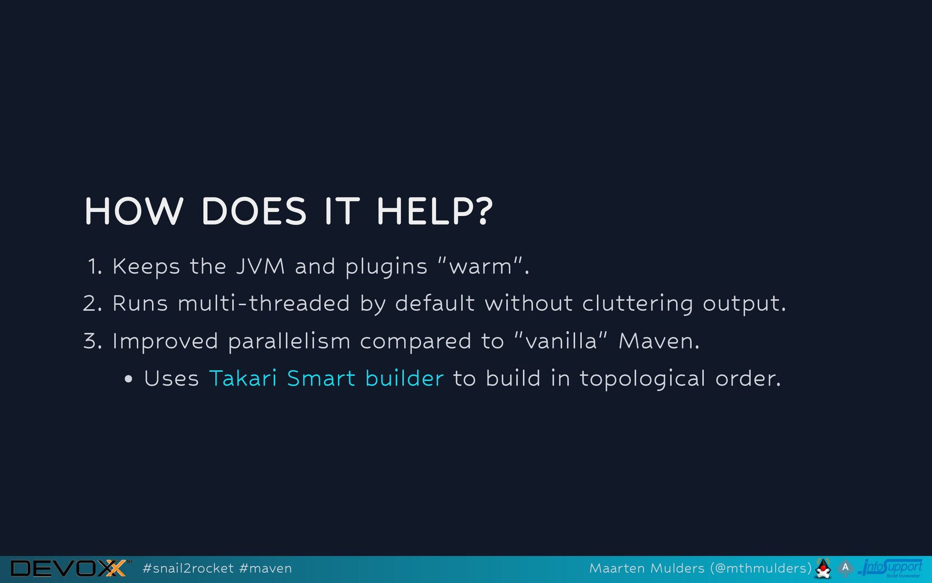 Join me to learn how to supercharge your Maven build! Iโll cover three main steps to start speeding up your project build. Learn how each speeds up your build, when they provide the biggest gains, and what pitfalls await.