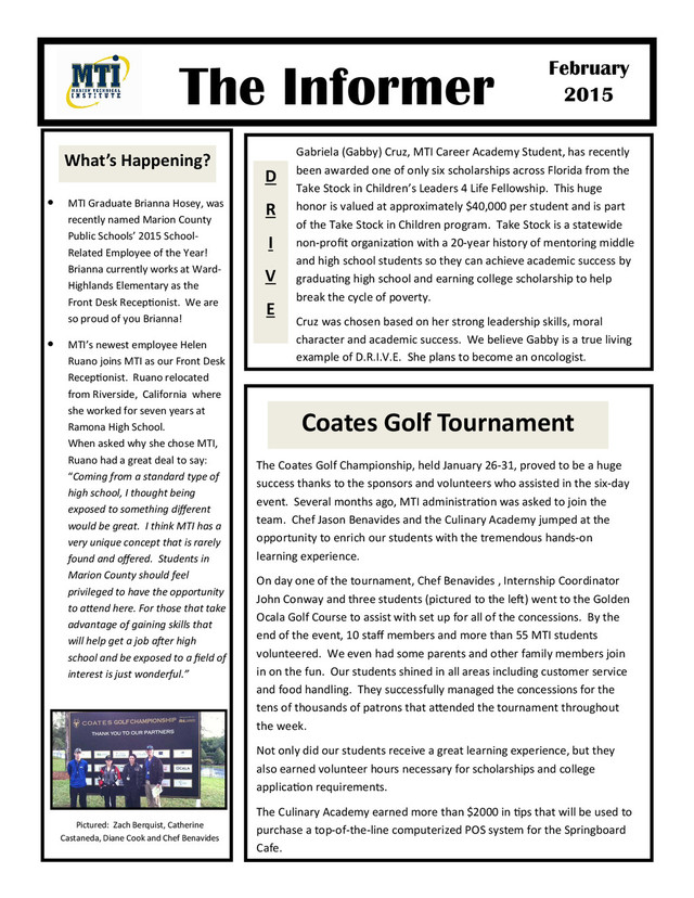recently named Marion County Public Schools’ 2015 School- Related Employee of the Year! Brianna currently works at Ward- Highlands Elementary as the Front Desk RecepƟonist. We are so proud of you Brianna! • MTI’s newest employee Helen Ruano joins MTI as our Front Desk RecepƟonist. Ruano relocated from Riverside, California where she worked for seven years at Ramona High School. When asked why she chose MTI, Ruano had a great deal to say: “Coming from a standard type of high school, I thought being exposed to something different would be great. I think MTI has a very unique concept that is rarely found and offered. Students in Marion County should feel privileged to have the opportunity to aƩend here. For those that take advantage of gaining skills that will help get a job aŌer high school and be exposed to a field of interest is just wonderful.” What’s Happening? Coates Golf Tournament D R I V E The Coates Golf Championship, held January 26-31, proved to be a huge success thanks to the sponsors and volunteers who assisted in the six-day event. Several months ago, MTI administraƟon was asked to join the team. Chef Jason Benavides and the Culinary Academy jumped at the opportunity to enrich our students with the tremendous hands-on learning experience. On day one of the tournament, Chef Benavides , Internship Coordinator John Conway and three students (pictured to the leŌ) went to the Golden Ocala Golf Course to assist with set up for all of the concessions. By the end of the event, 10 staff members and more than 55 MTI students volunteered. We even had some parents and other family members join in on the fun. Our students shined in all areas including customer service and food handling. They successfully managed the concessions for the tens of thousands of patrons that aƩended the tournament throughout the week. Not only did our students receive a great learning experience, but they also earned volunteer hours necessary for scholarships and college applicaƟon requirements. The Culinary Academy earned more than $2000 in Ɵps that will be used to purchase a top-of-the-line computerized POS system for the Springboard Cafe. Gabriela (Gabby) Cruz, MTI Career Academy Student, has recently been awarded one of only six scholarships across Florida from the Take Stock in Children’s Leaders 4 Life Fellowship. This huge honor is valued at approximately $40,000 per student and is part of the Take Stock in Children program. Take Stock is a statewide non-profit organizaƟon with a 20-year history of mentoring middle and high school students so they can achieve academic success by graduaƟng high school and earning college scholarship to help break the cycle of poverty. Cruz was chosen based on her strong leadership skills, moral character and academic success. We believe Gabby is a true living example of D.R.I.V.E. She plans to become an oncologist. Pictured: Zach Berquist, Catherine Castaneda, Diane Cook and Chef Benavides
