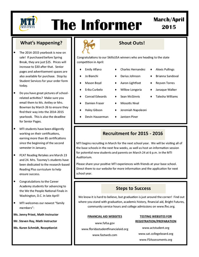 on sale! If purchased before Spring Break, they are just $25. Prices will increase to $30 after that. Senior pages and advertisement spaces are also available for purchase. Stop by Student Services for your order form today. Do you have great pictures of school- related activities? Make sure you email them to Ms. Antley or Mrs. Bowman by March 26 to ensure they find their way into the 2014-2015 yearbook. This is also the deadline for Senior Pages. MTI students have been diligently working on their certifications, earning more than 85 certifications since the beginning of the second semester in January. FCAT Reading Retakes are March 23 and 24. Mrs. Toomey‘s students have been dedicated to the research-based Reading Plus curriculum to help ensure success. Congratulations to the Career Academy students for advancing to the We the People National Finals in Washington, D.C. in late April! MTI welcomes our newest “family members”: Ms. Jenny Priest, Math Instructor Mr. Steven Ray, Math Instructor Ms. Karen Schmidt, Receptionist What’s Happening? Shout Outs! Congratulations to our SkillsUSA winners who are heading to the state competition in April: Recruitment for 2015 - 2016 MTI begins recruiting in March for the next school year. We will be visiting all of the base schools in the next few weeks, as well as host an information session for potential new students and parents on March 24 at 6 p.m. in the MTI Auditorium. Please share your positive MTI experiences with friends at your base school. Direct them to our website for more information and the application for next school year. Steps to Success We know it is hard to believe, but graduation is just around the corner! Find out where you stand with graduation, academic history, financial aid, Bright Futures, community service hours and college admissions on www.flvc.org. Emily Alfano Jo Bianchi Mason Boyd Erika Curbelo Conrad Edwards Damien Fraser Haley Gibson Devin Hauserman Charles Hernandez Darius Johnson Aaron Lightfoot Willow Longoria Sean McGinnis Miosotis Nival Jeremiah Napoleoni Jantzen Piner Alexis Pullings Brianna Sandoval Reyven Torres Janaque Walker Talesha Williams FINANCIAL AID WEBSITES www.fafsa.gov www.floridastudentfinancialaid.org www.fastweb.com TESTING WEBSITES FOR REGISTRATION/PREPARATION www.actstudent.org www.sat.collegeboard.org www.FSAssessments.org