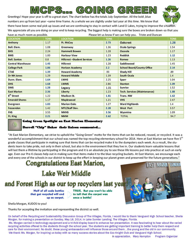 Oakcrest 1.28 Bell. Elem. 1.08 Greenway 1.36 Ocala Springs 1.54 BHS 2.24 Hammett Bowen 1.28 Osceola 1.17 BMS 1.00 Harbour View 1.23 Reddick 1.12 Bell. Santos 0.8 Hillcrest –Student Services 1.26 Romeo 1.13 Central Warehouse 1.45 Hillcrest 1.28 Saddlewood 1.45 College Park 1.86 Horizon Academy 2.2 School Board/County Office 2.14 CTAE 1.39 Howard Academy .93 Shady Hill .89 Dr NH Jones 1.29 Howard Middle 1.39 South Ocala 1.4 Dunn. Elem. 1.64 LWHS 2.25 Sparr 1.04 DHS 1.68 LWMS 2.86 Stanton 1.09 DMS 1.28 Legacy 1.01 Sunrise 1.52 East Marion 2.36 Liberty 1.23 Tech. Services (Maintenance) 1.88 8th Street 1.22 Madison St. 1.81 Trans. NW 1.62 Emerald Shores 1.17 Maplewood 1.21 VHS 2.47 Evergreen 1.83 Marion Oaks 1.27 Ward Highlands 1.4 Fessenden 1.42 MTI/Staff Dev. 2.28 West Port 3.57 FHS 3.55 NMHS 3.56 Wyomina 1.09 Ft. King 2.21 NMM 2.62 TOTAL 94.7 Greetings! Hope your year is off to a great start. The chart below has the totals July-September. All the bold ,blue numbers are up from last year –same time frame. As a whole we are slightly under last year at this time. We know that there have been some real pick up issues and we are continuing to stay in contact with Land O Lakes, trying to improve the situation. We appreciate all you are doing on your end to keep recycling. The biggest help is making sure the boxes are broken down-so that you have as much room as possible. Please let us know if we can help you. Triste and Duncan 906 tons Recycled Sheila Morgan, KUDOS to you! Thanks for accepting the invitation and representing the district so well. On behalf of the Recycling and Sustainability Discussion Group of The Villages, Florida, I would like to thank Vanguard High School teacher, Sheila Morgan, for making a presentation on Sunday, May 18, 2014, in Lake Sumter Landing, The Villages, Florida. Ms. Morgan carried in technology equipment and a tri-fold display board to enhance her presentation. It was fascinating to hear about the varied recycling activities offered to the students through the school year. The students are getting important training to better help them respect and care for their environment. No doubt, these young ambassadors will influence those around them....the young and the old in our community. We thank Ms. Morgan, for inspiring us today with so many success stories about the Eco-Knight Club and Vanguard High School. In appreciation, Mary Hampton Program Organizer “At East Marion Elementary, we strive to uphold the “Going Green” motto for the items that can be reduced, reused, or recycled. It was a wonderful accomplishment that our school was named the top recycling elementary school for 2014. Here at East Marion we have five 5th grade classes that participate in making sure that items that can be recycled make it to the dumpsters each week. As a result, the stu- dents learn to take pride, not only in their school, but also in the environment that they live in. Our students learn valuable lessons that will last them a lifetime by participating in the program and it is an absolute joy to see these life lessons put into practice at such an early age. Even our Pre-K classes help out in making sure that items make it to the blue recycling buckets. At East Marion, we encourage each and every one of the schools in our district to keep up the effort in keeping our planet green and preserved for the future generations.” Going Green Spotlight on East Marion Elementary Darrell “Chip” Baker their liaison commented...