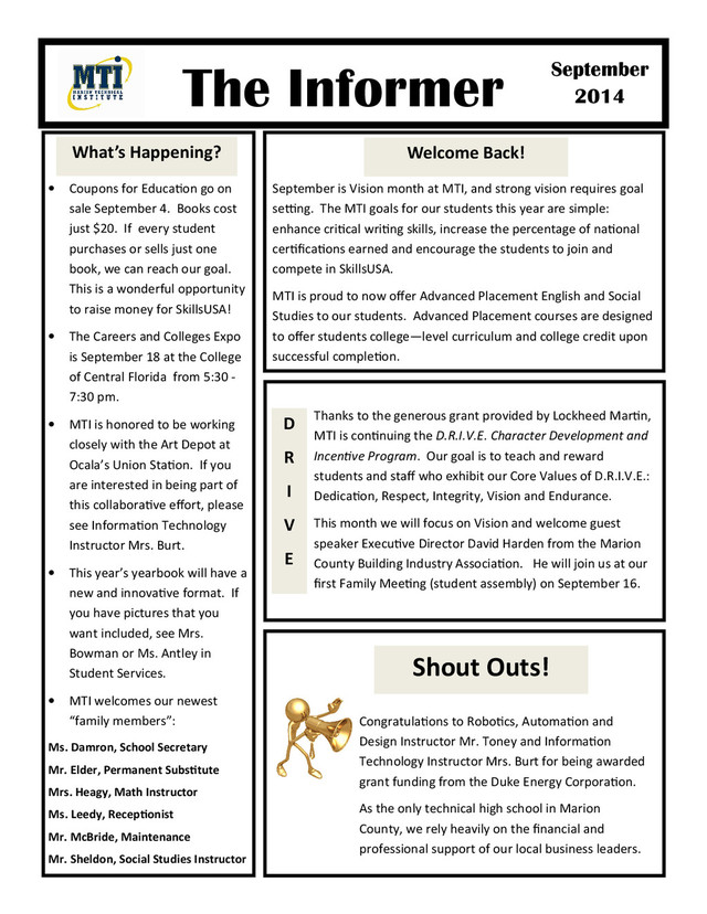 sale September 4. Books cost just $20. If every student purchases or sells just one book, we can reach our goal. This is a wonderful opportunity to raise money for SkillsUSA! • The Careers and Colleges Expo is September 18 at the College of Central Florida from 5:30 - 7:30 pm. • MTI is honored to be working closely with the Art Depot at Ocala’s Union StaƟon. If you are interested in being part of this collaboraƟve effort, please see InformaƟon Technology Instructor Mrs. Burt. • This year’s yearbook will have a new and innovaƟve format. If you have pictures that you want included, see Mrs. Bowman or Ms. Antley in Student Services. • MTI welcomes our newest “family members”: Ms. Damron, School Secretary Mr. Elder, Permanent SubsƟtute Mrs. Heagy, Math Instructor Ms. Leedy, RecepƟonist Mr. McBride, Maintenance Mr. Sheldon, Social Studies Instructor What’s Happening? Welcome Back! Shout Outs! D R I V E September is Vision month at MTI, and strong vision requires goal seƫng. The MTI goals for our students this year are simple: enhance criƟcal wriƟng skills, increase the percentage of naƟonal cerƟficaƟons earned and encourage the students to join and compete in SkillsUSA. MTI is proud to now offer Advanced Placement English and Social Studies to our students. Advanced Placement courses are designed to offer students college—level curriculum and college credit upon successful compleƟon. CongratulaƟons to RoboƟcs, AutomaƟon and Design Instructor Mr. Toney and InformaƟon Technology Instructor Mrs. Burt for being awarded grant funding from the Duke Energy CorporaƟon. As the only technical high school in Marion County, we rely heavily on the financial and professional support of our local business leaders. Thanks to the generous grant provided by Lockheed MarƟn, MTI is conƟnuing the D.R.I.V.E. Character Development and IncenƟve Program. Our goal is to teach and reward students and staff who exhibit our Core Values of D.R.I.V.E.: DedicaƟon, Respect, Integrity, Vision and Endurance. This month we will focus on Vision and welcome guest speaker ExecuƟve Director David Harden from the Marion County Building Industry AssociaƟon. He will join us at our first Family MeeƟng (student assembly) on September 16.