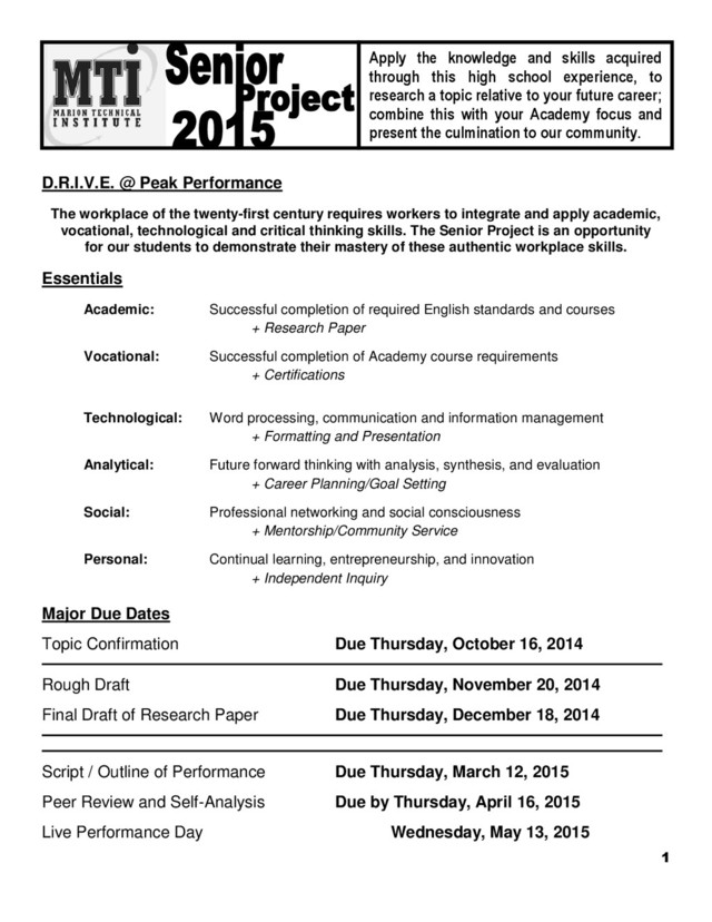 century requires workers to integrate and apply academic, vocational, technological and critical thinking skills. The Senior Project is an opportunity for our students to demonstrate their mastery of these authentic workplace skills. Essentials Academic: Successful completion of required English standards and courses + Research Paper Vocational: Successful completion of Academy course requirements + Certifications Technological: Word processing, communication and information management + Formatting and Presentation Analytical: Future forward thinking with analysis, synthesis, and evaluation + Career Planning/Goal Setting Social: Professional networking and social consciousness + Mentorship/Community Service Personal: Continual learning, entrepreneurship, and innovation + Independent Inquiry Major Due Dates Topic Confirmation Due Thursday, October 16, 2014 Rough Draft Due Thursday, November 20, 2014 Final Draft of Research Paper Due Thursday, December 18, 2014 Script / Outline of Performance Due Thursday, March 12, 2015 Peer Review and Self-Analysis Due by Thursday, April 16, 2015 Live Performance Day Wednesday, May 13, 2015 Apply the knowledge and skills acquired through this high school experience, to research a topic relative to your future career; combine this with your Academy focus and present the culmination to our community.
