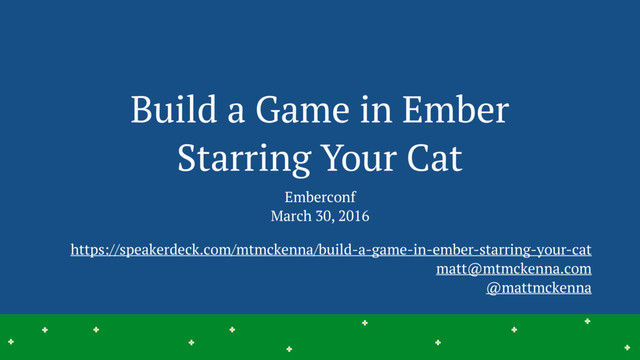 30, 2016 1 > > > > > > > > > > > > > > > > > > > > > > > > > > > > > > > > > > > > > > > > > > > > > > > > > > https://speakerdeck.com/mtmckenna/build-a-game-in-ember-starring-your-cat [email protected] @mattmckenna