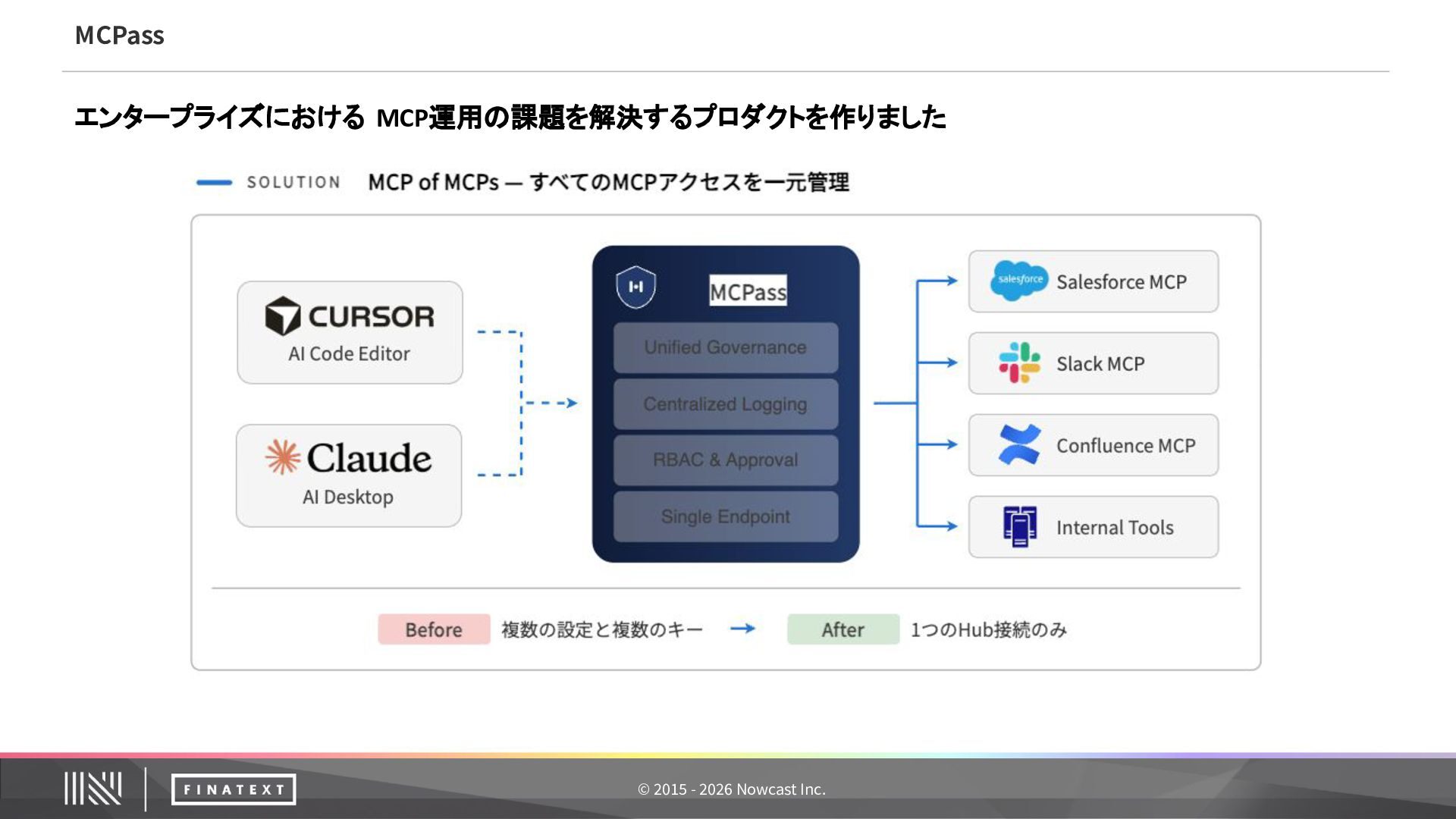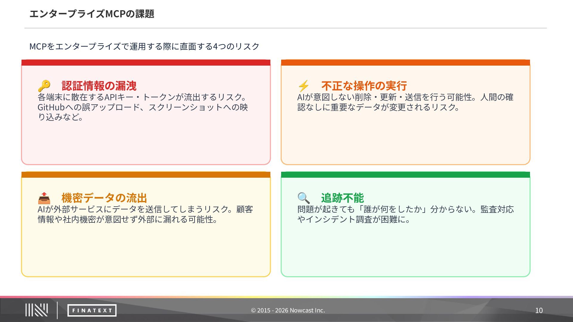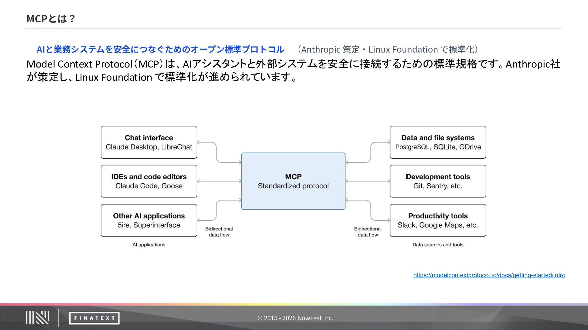 Protocol(MCP)は、AIアシスタントと外部システムを安全に接続するための標準規格です。Anthropic社 が策定し、Linux Foundation で標準化が進められています。 AIと業務システムを安全につなぐためのオープン標準プロトコル (Anthropic 策定‧Linux Foundation で標準化)