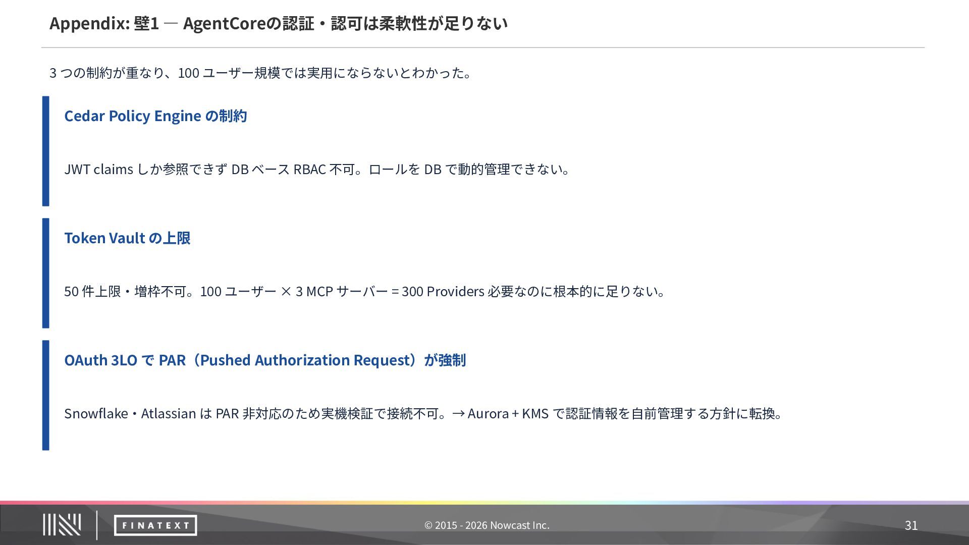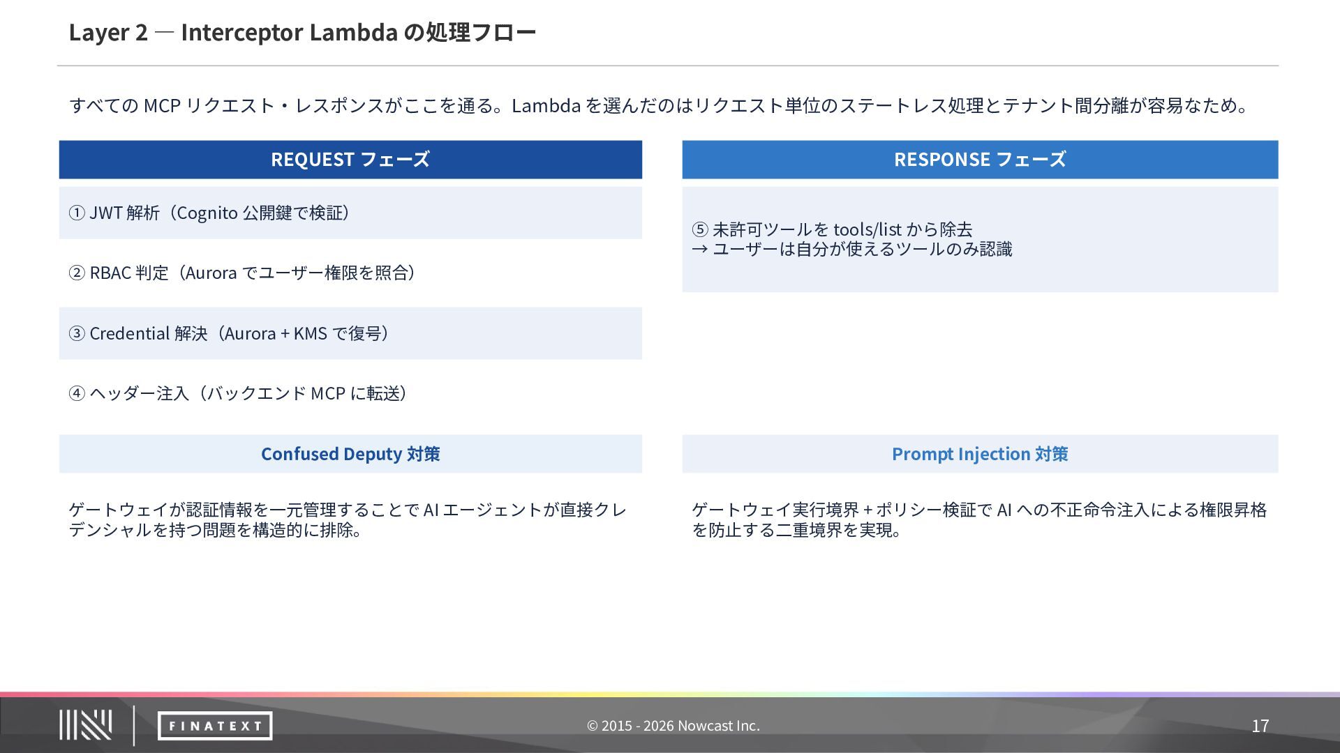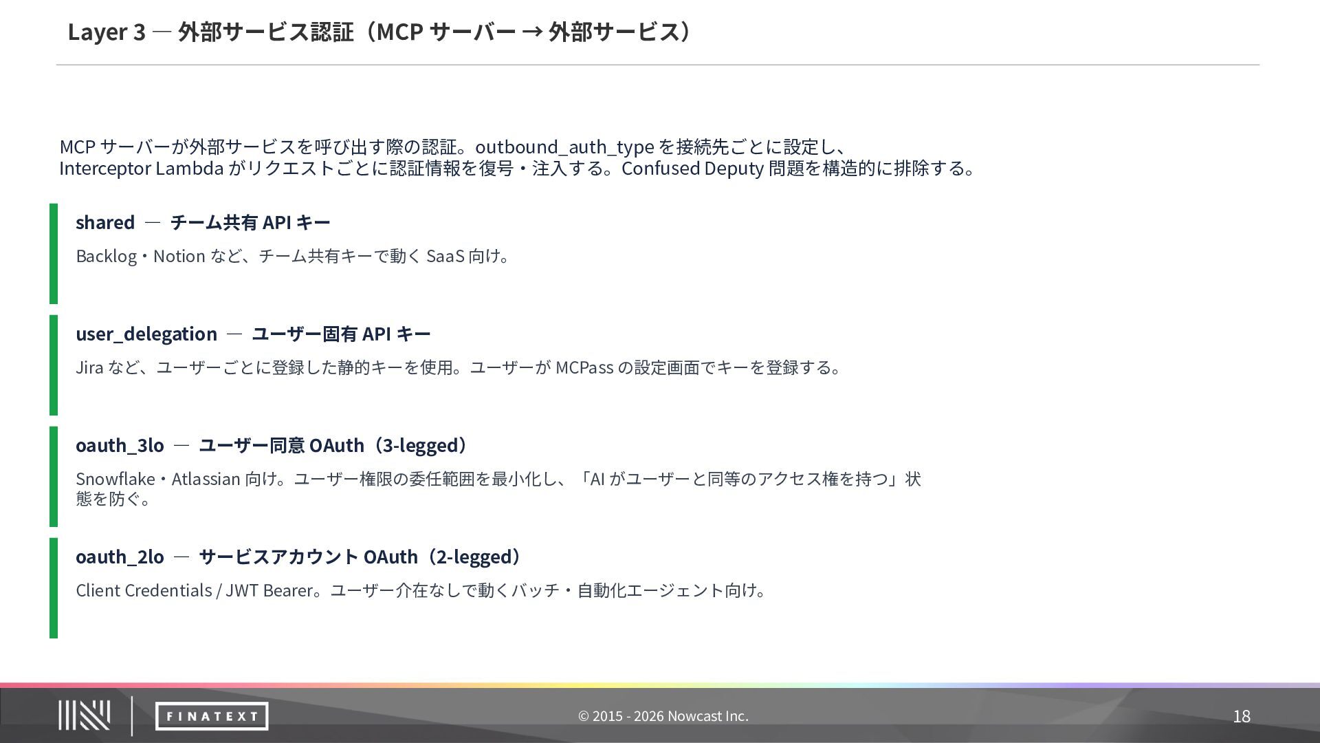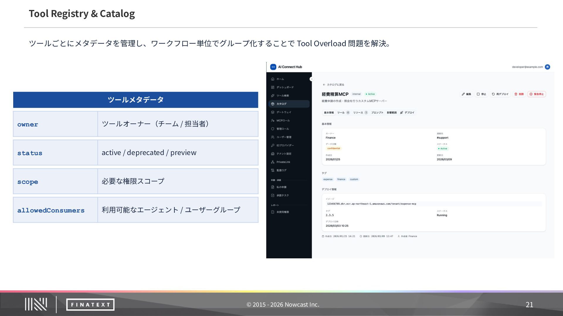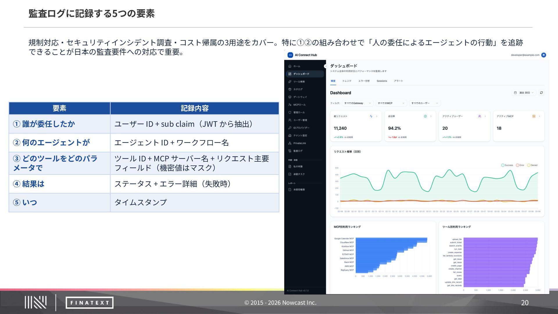 記録内容 ① 誰が委任したか ユーザー ID + sub claim(JWT から抽出) ② 何のエージェントが エージェント ID + ワークフロー名 ③ どのツールをどのパラ メータで ツール ID + MCP サーバー名 + リクエスト主要 フィールド(機密値はマスク) ④ 結果は ステータス + エラー詳細(失敗時) ⑤ いつ タイムスタンプ 20