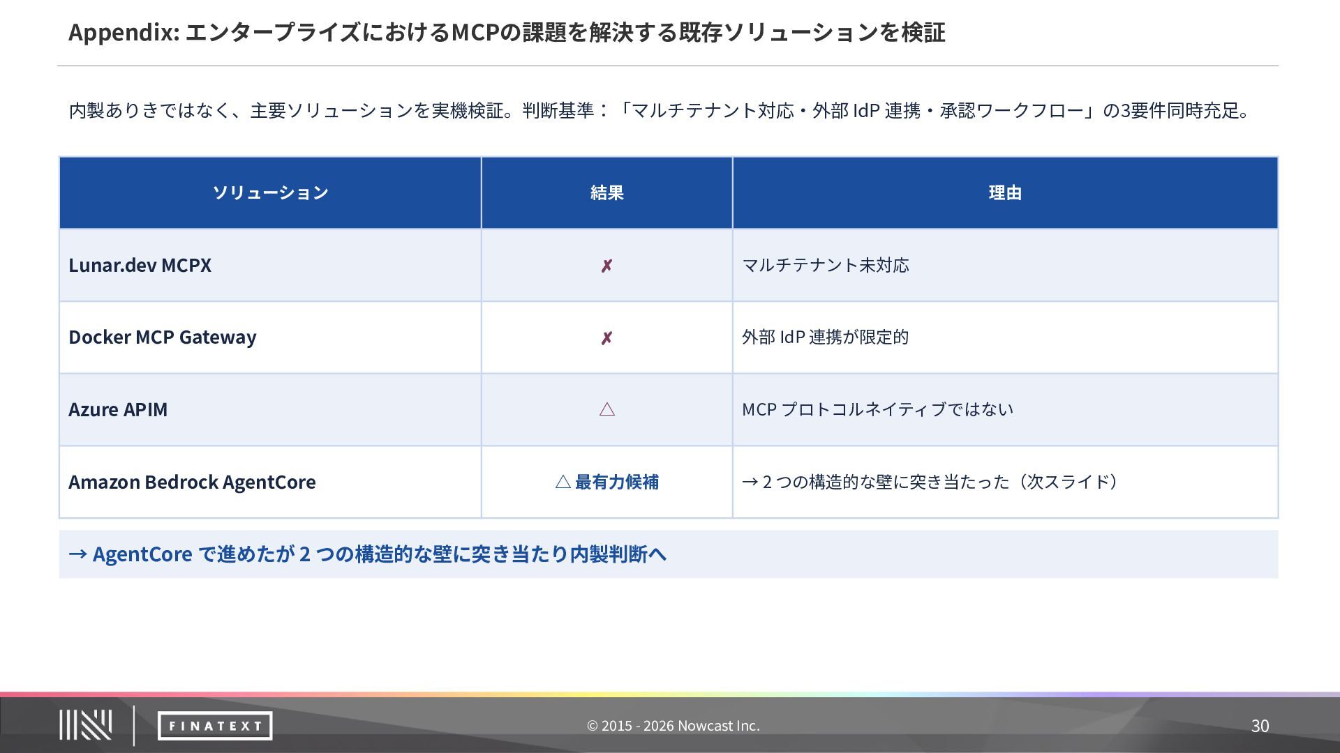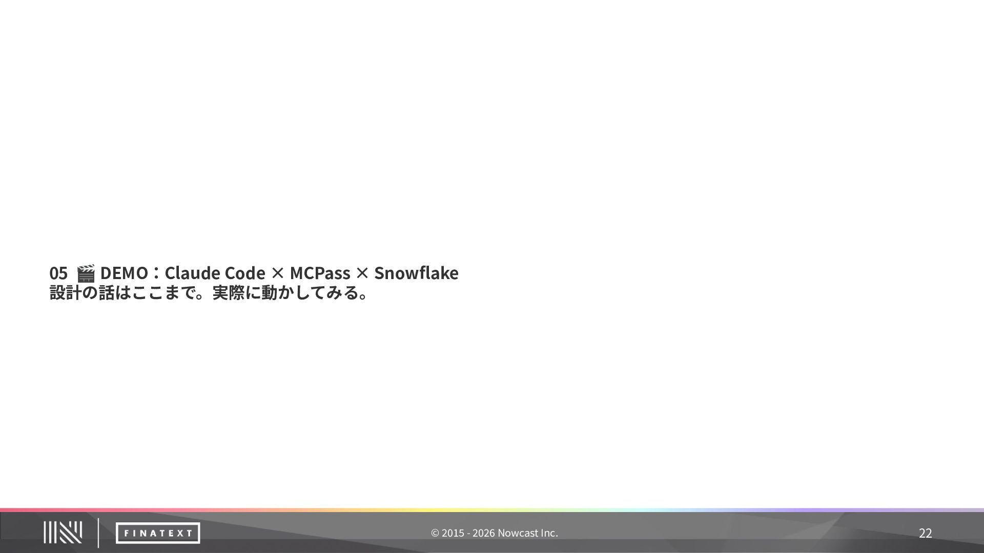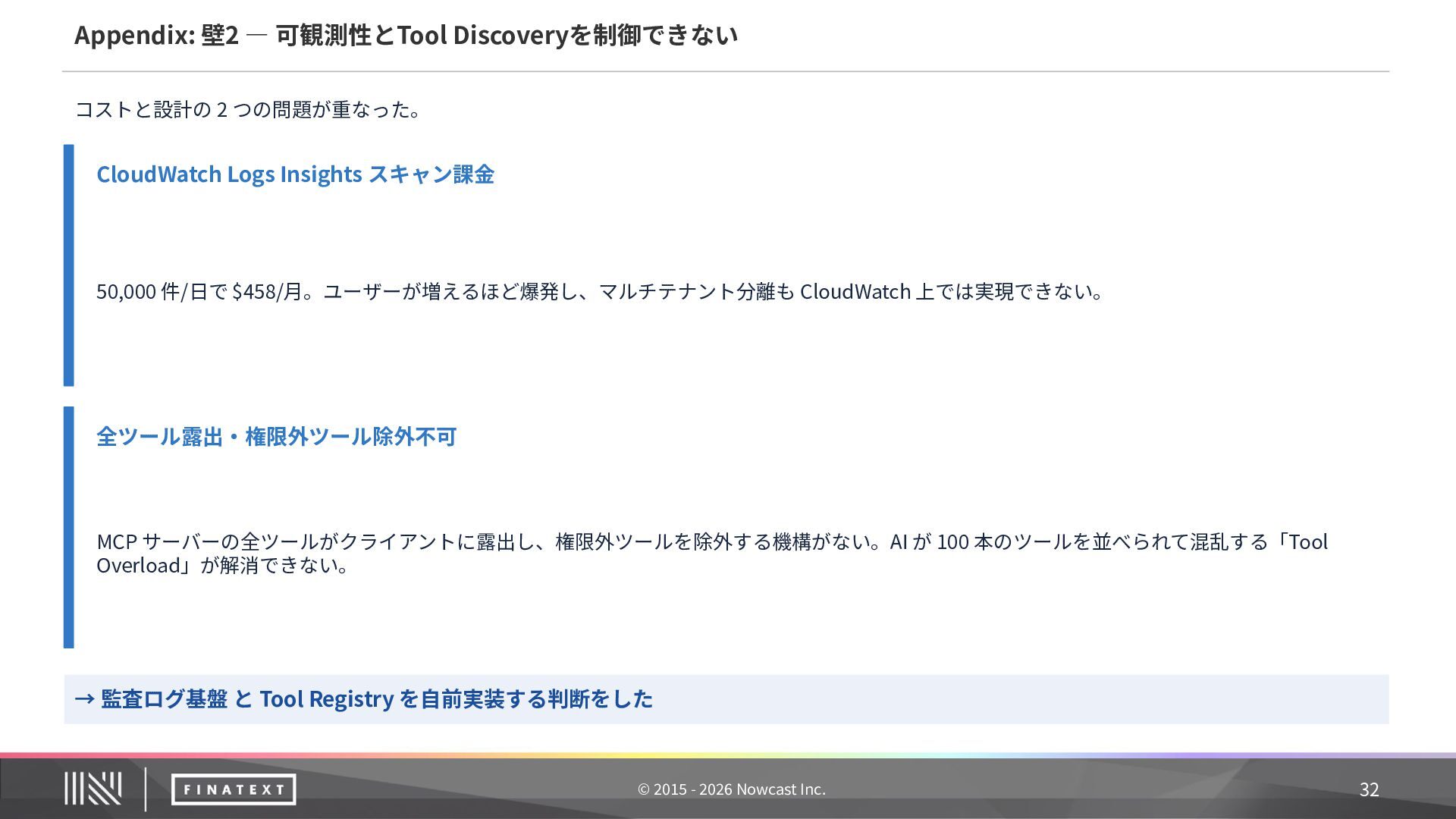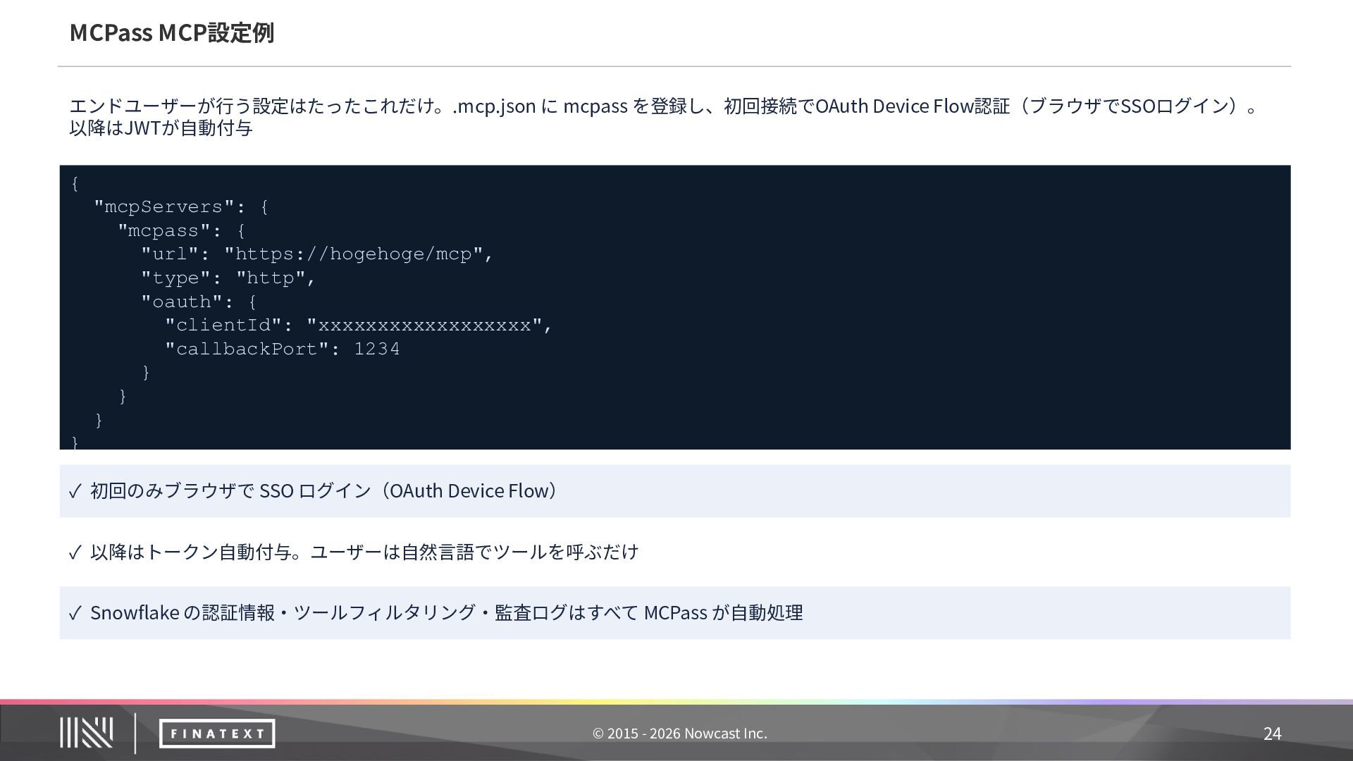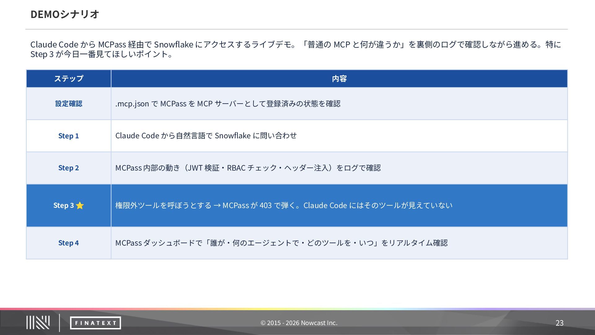 記録内容 ① 誰が委任したか ユーザー ID + sub claim(JWT から抽出) ② 何のエージェントが エージェント ID + ワークフロー名 ③ どのツールをどのパラ メータで ツール ID + MCP サーバー名 + リクエスト主要 フィールド(機密値はマスク) ④ 結果は ステータス + エラー詳細(失敗時) ⑤ いつ タイムスタンプ 20