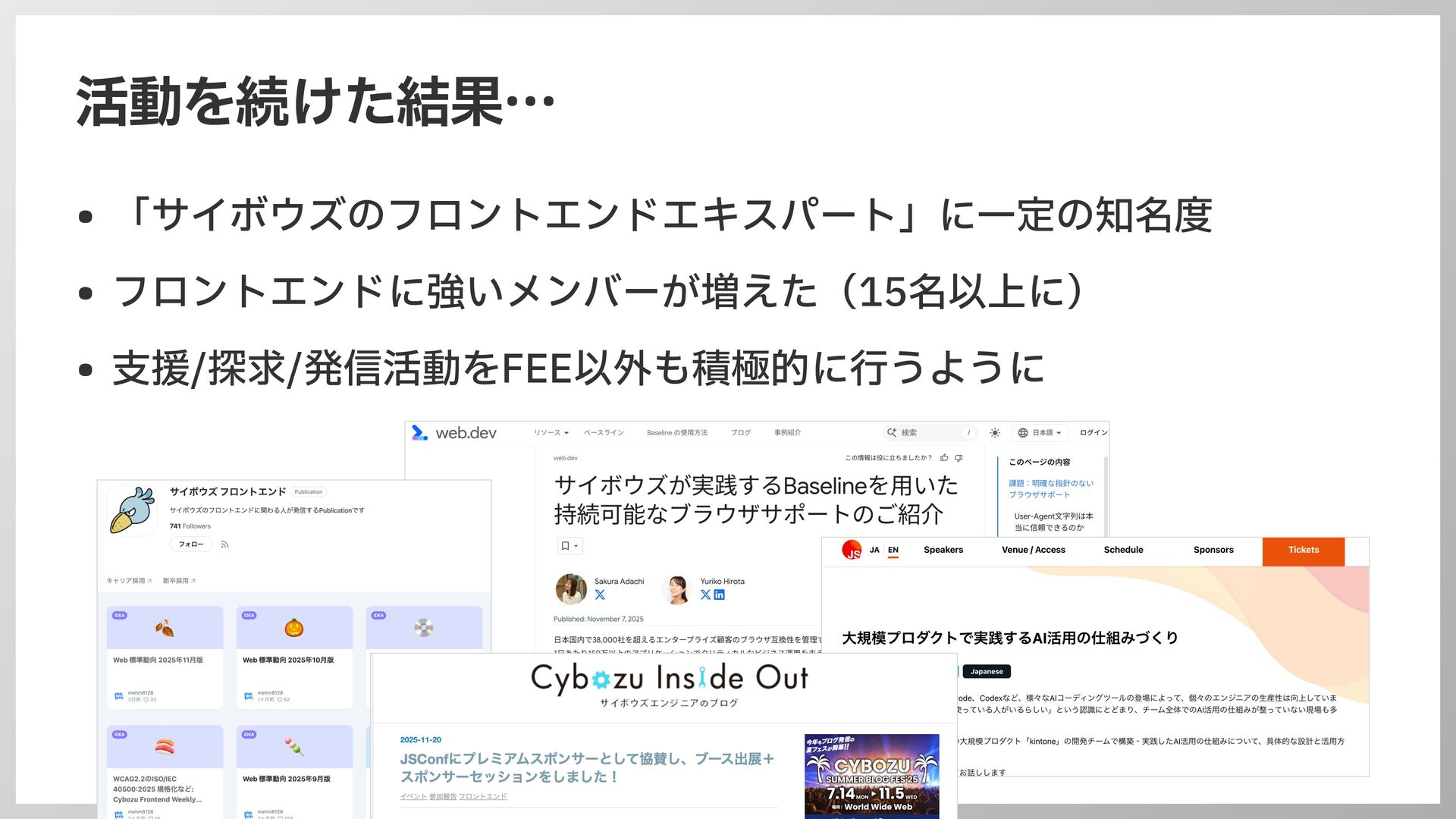 活動を続けた結果… • 「サイボウズのフロントエンドエキスパート」に 一 定の知名度 • フロントエンドに強いメンバーが増えた(15名以上に) • 支 援/探求/発信活動をFEE以外も積極的に