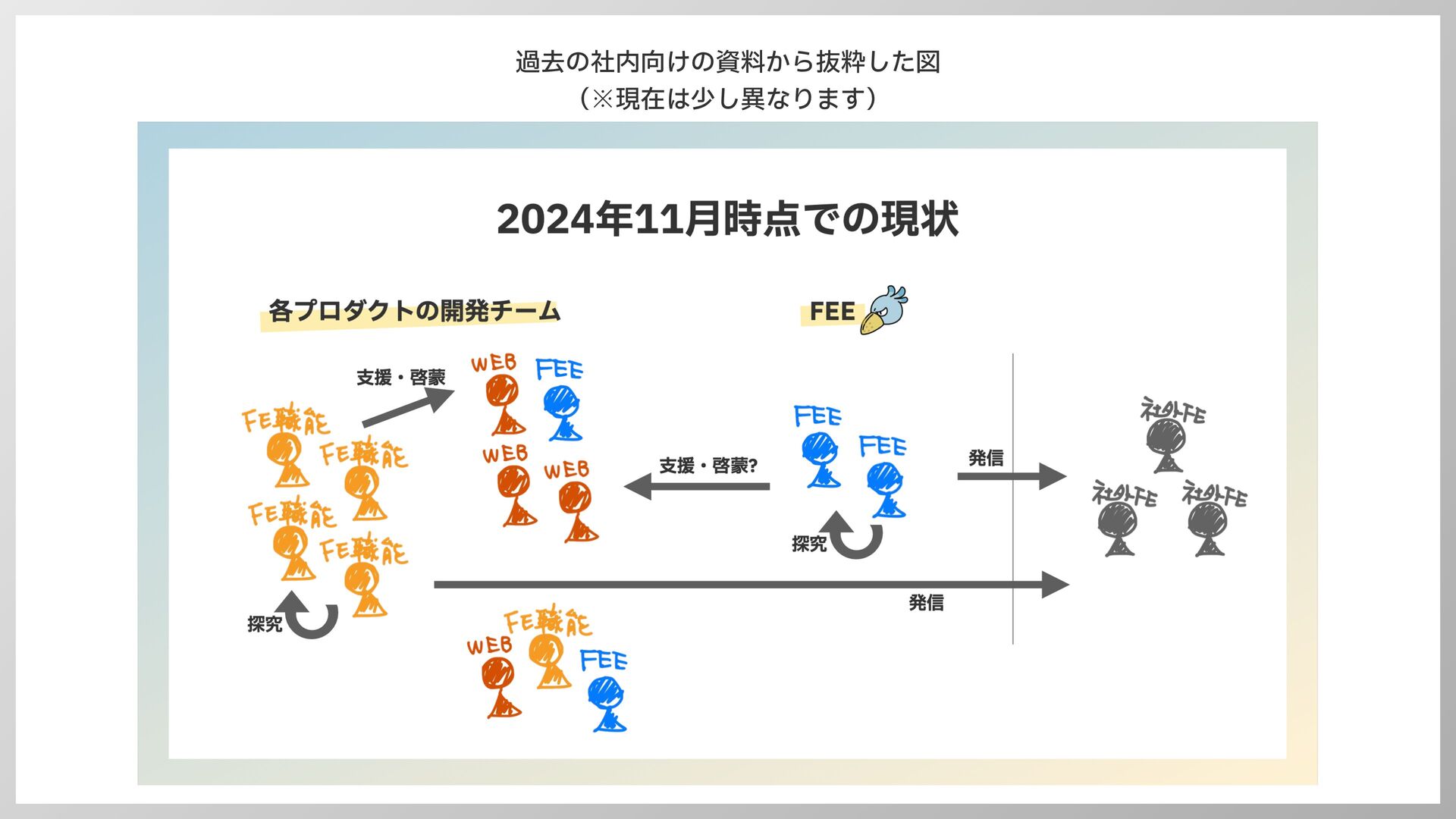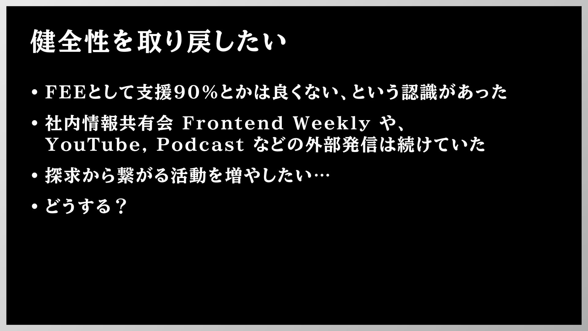 健全性を取り戻したい • FEEとして支援90%とかは良くない、という認識があった • 社内情報共有会 Frontend Weekly や、 YouTube, Podcast
