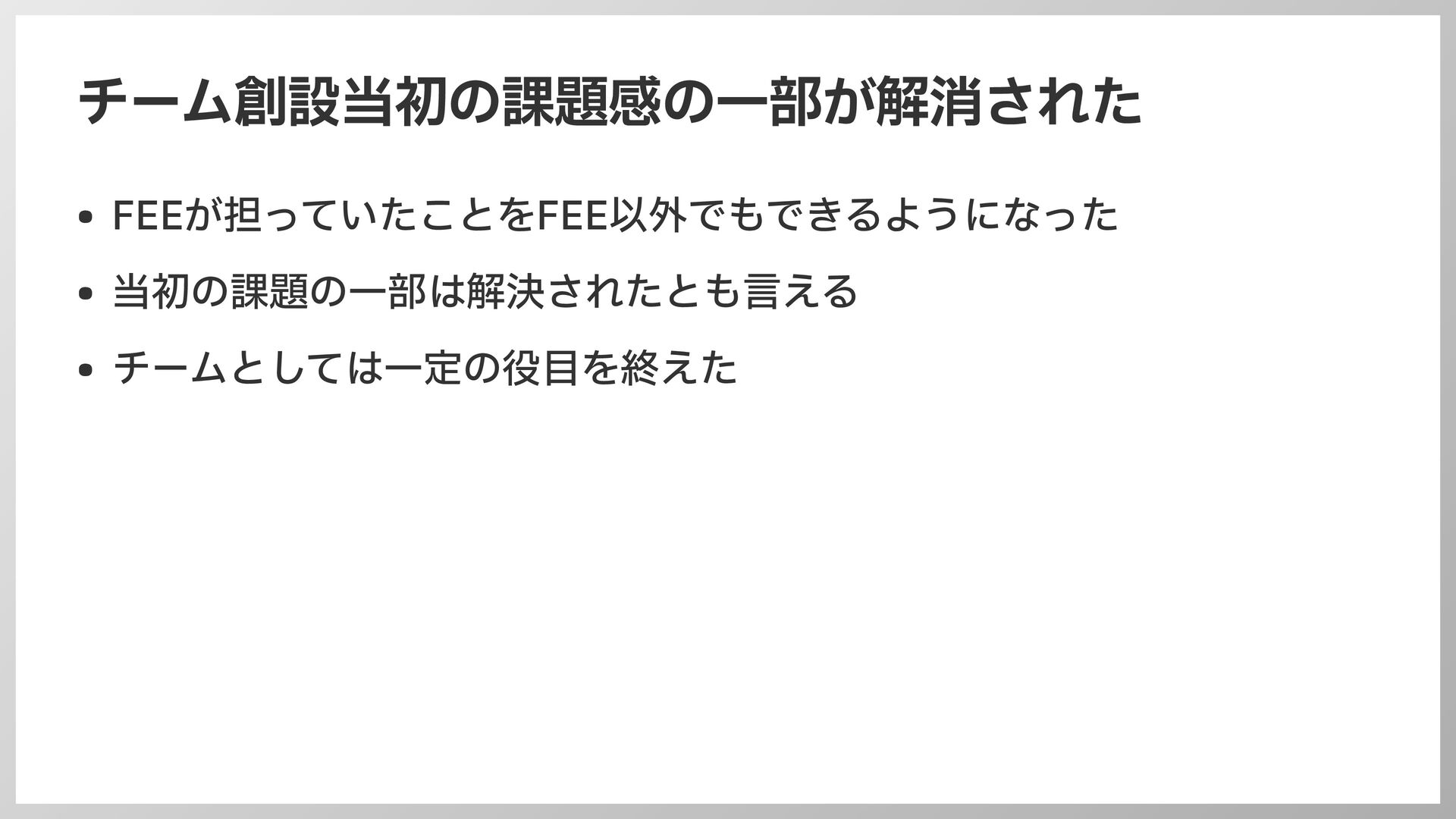 チーム創設当初の課題感の 一 部が解消された • FEEが担っていたことをFEE以外でもできるようになった • 当初の課題の 一 部は解決されたとも 言