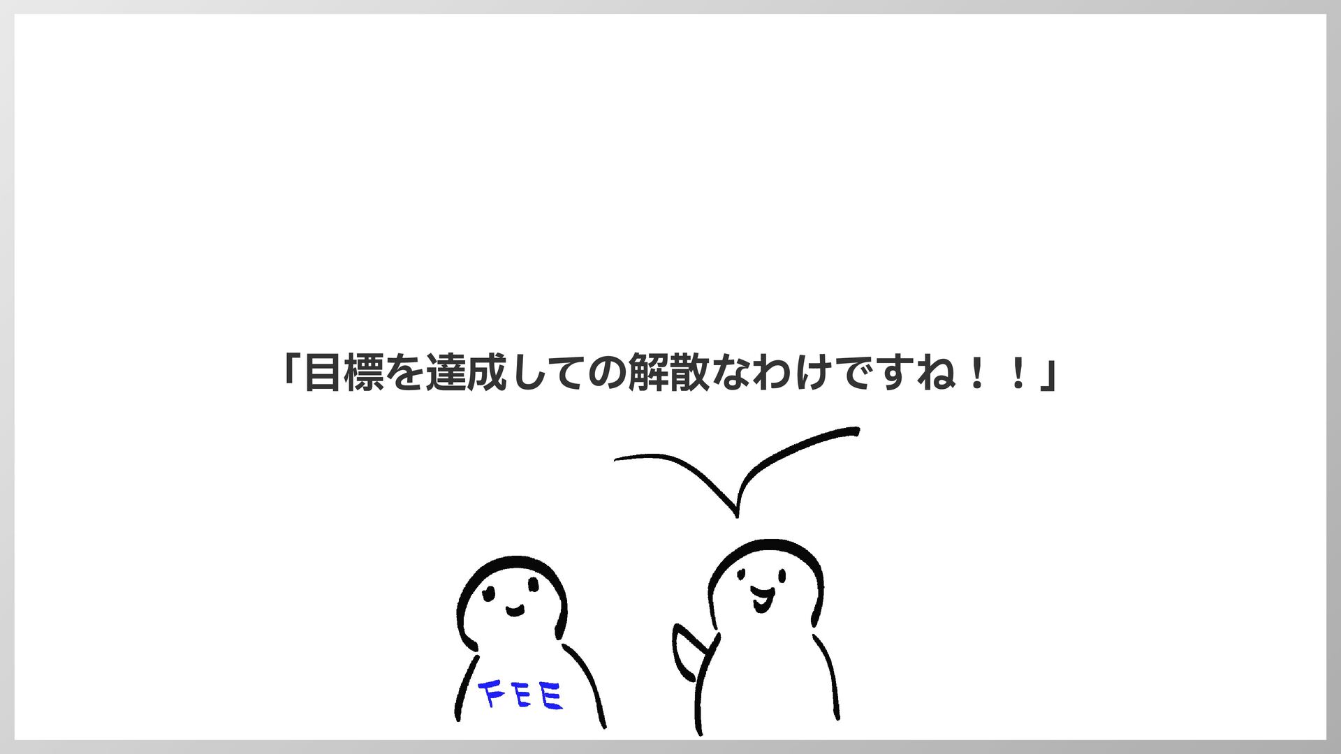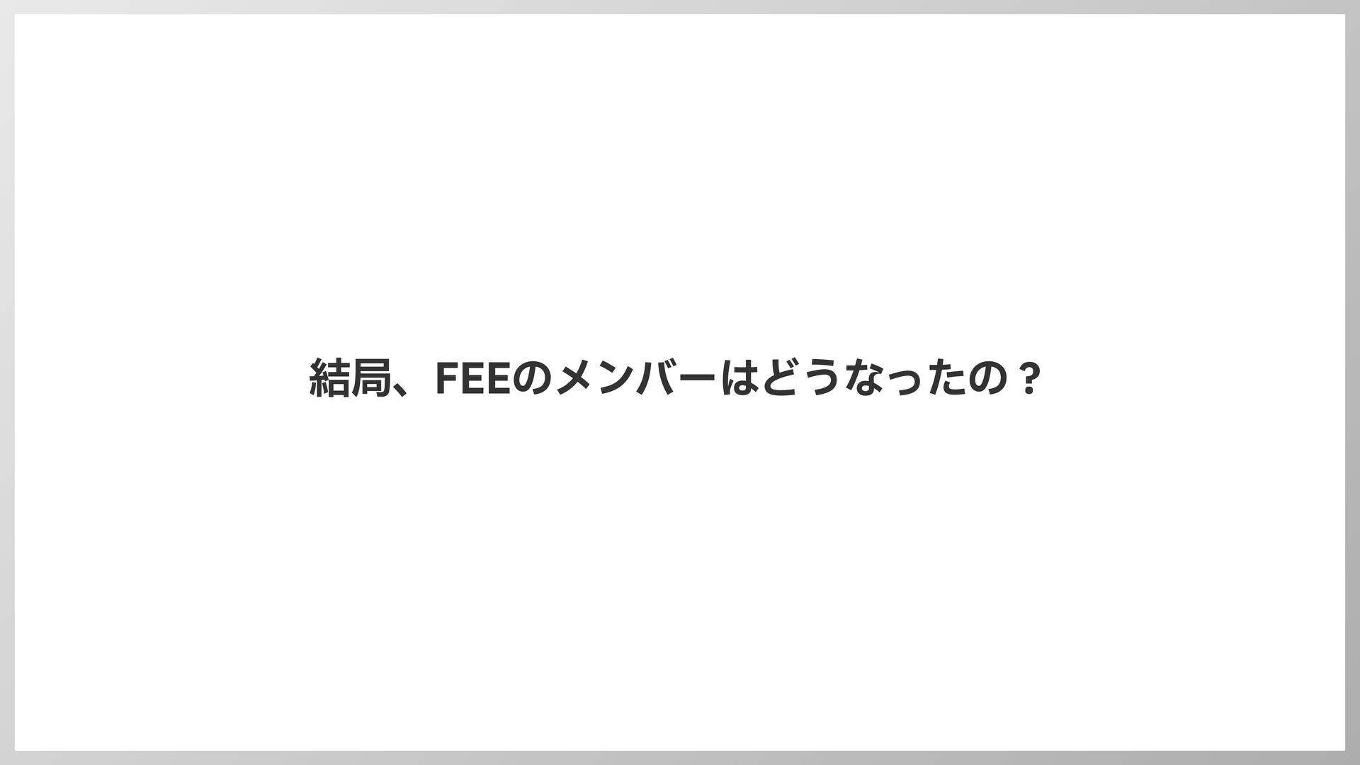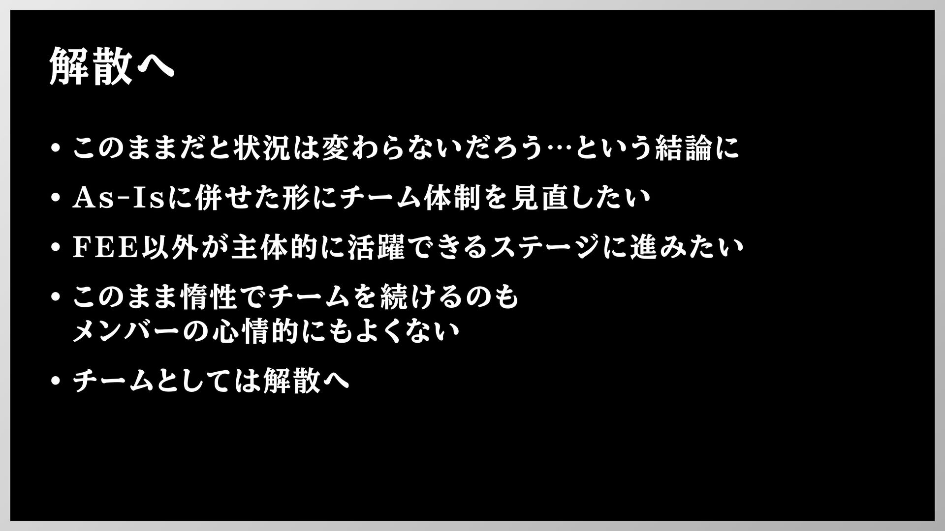 解散へ • このままだと状況は変わらないだろう…という結論に • As-Isに併せた形にチーム体制を見直したい • FEE以外が主体的に活躍できるステージに進みたい • このまま惰性でチームを続けるのも メンバーの心情的にもよくない