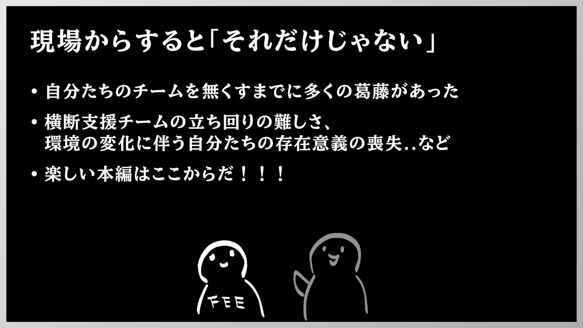 現場からすると「それだけじゃない」 • 自分たちのチームを無くすまでに多くの葛藤があった • 横断支援チームの立ち回りの難しさ、 環境の変化に伴う自分たちの存在意義の喪失..など • 楽しい本編はここからだ!!!