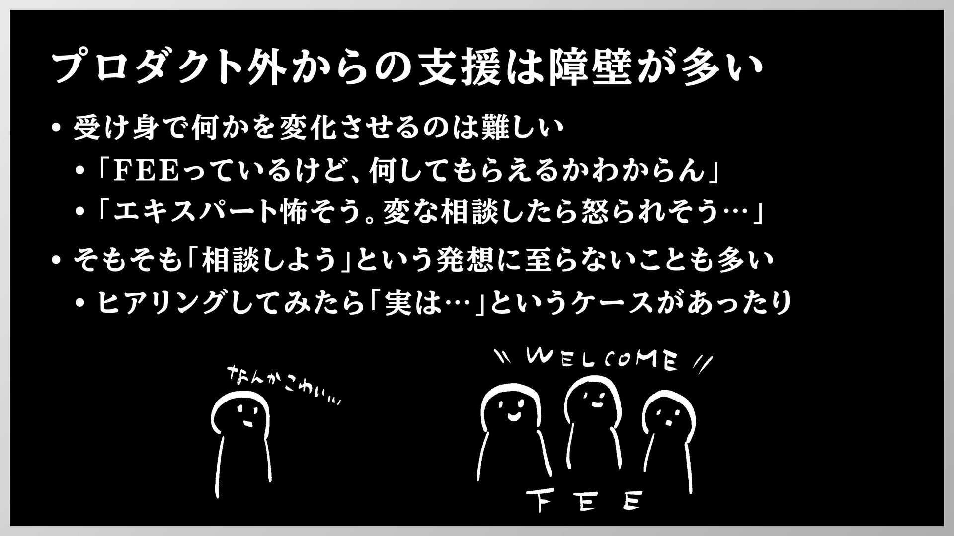 プロダクト外からの支援は障壁が多い • 受け身で何かを変化させるのは難しい • 「FEEっているけど、何してもらえるかわからん」 • 「エキスパート怖そう。変な相談したら怒られそう…」 • そもそも「相談しよう」という発想に至らないことも多い •
